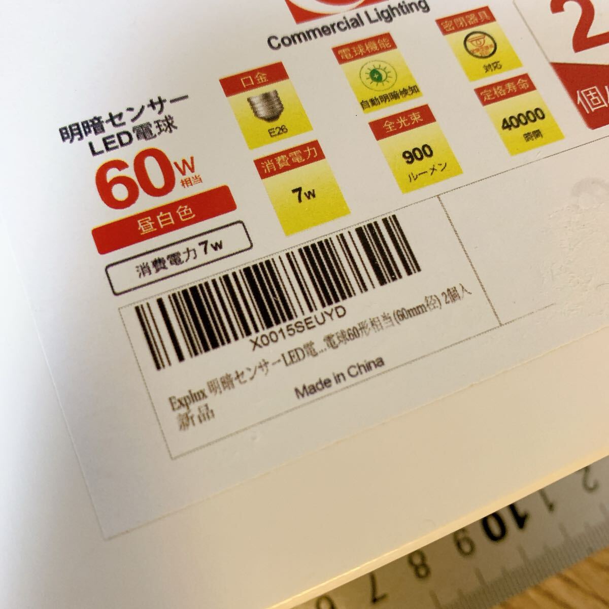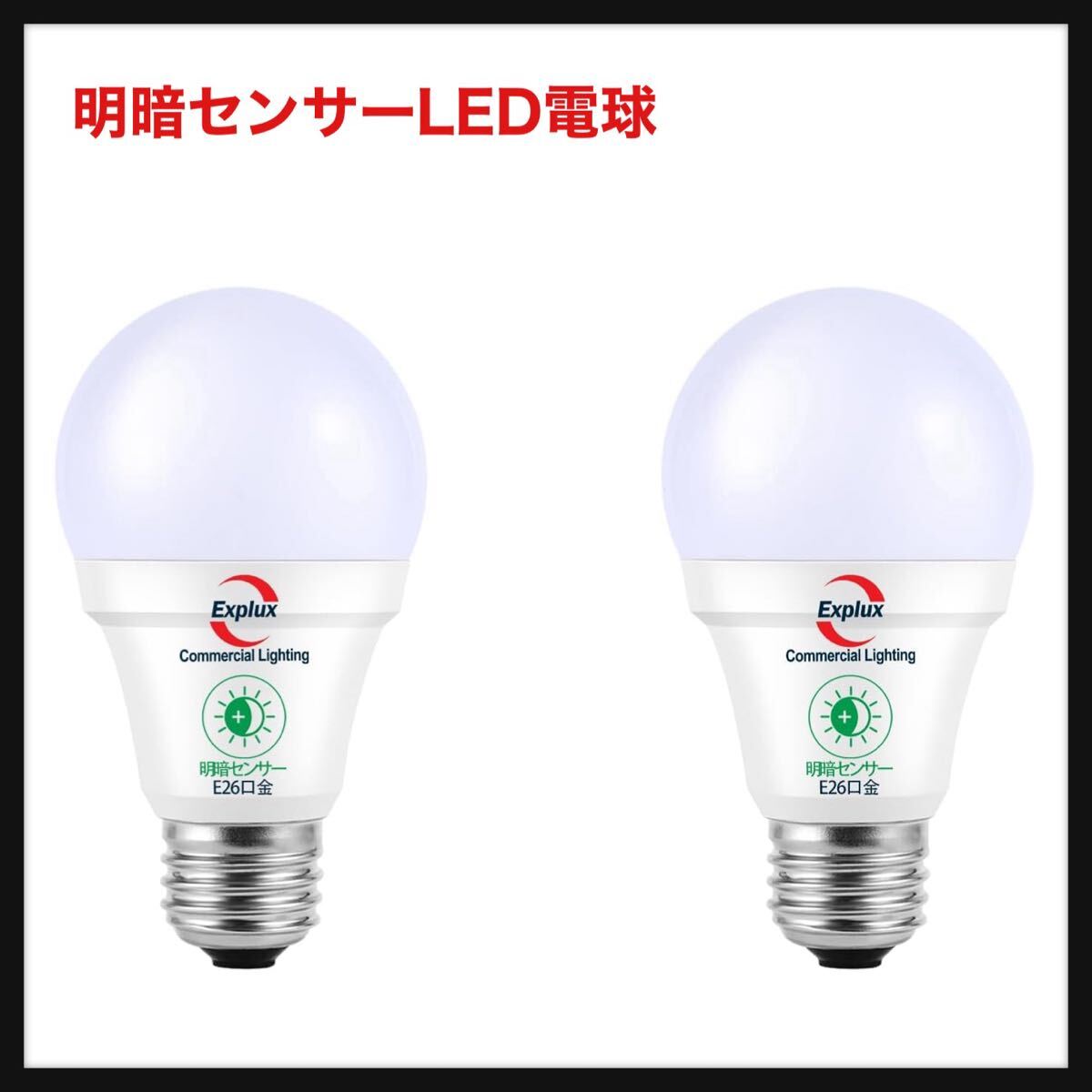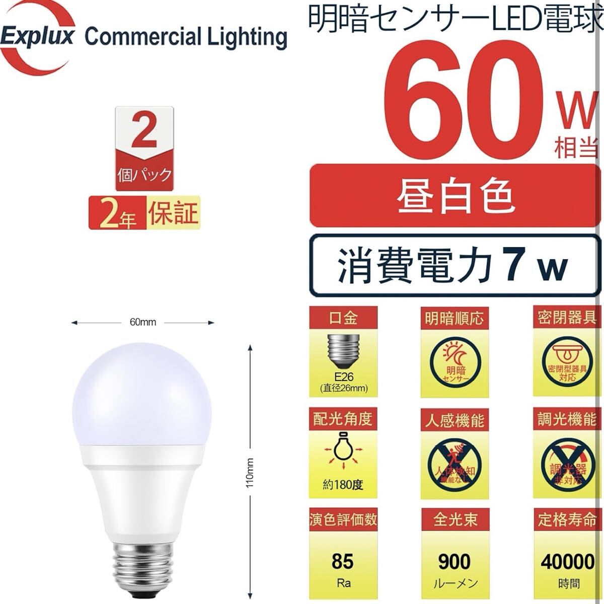 明暗センサーLED電球 (人体検知機能なし) E26口金 60W相当 900lm 昼白色 常夜灯 暗くなると自動で点灯・明るくなると自動で消灯 密閉形器具対応 電球60形相当(60mm径) 2個入