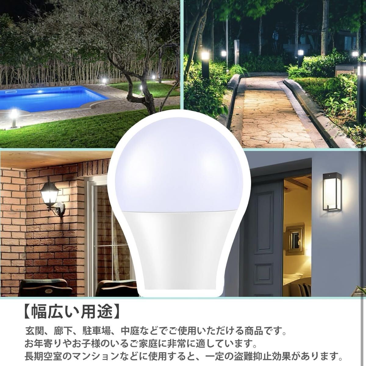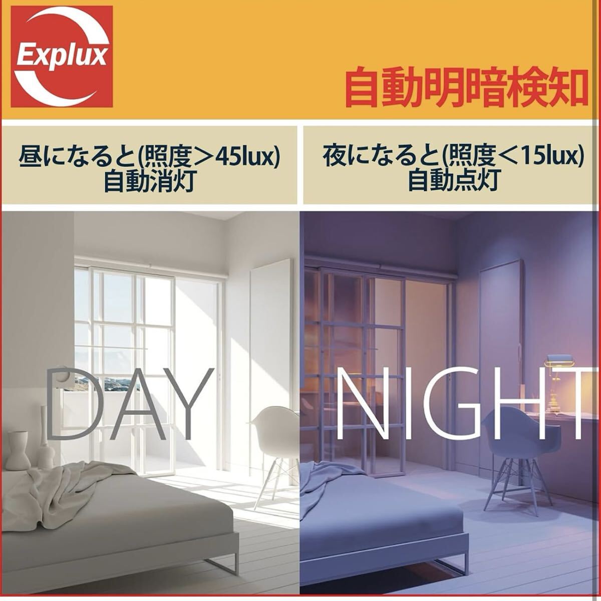 [自動明暗検知] 内蔵された光センサーモジュールが外部照度を検知して、ライトのオン・オフを自動調節できます。夜になると(照度<15lux)、自動点灯;昼になると(照度>45lux)、自動消灯。(人体検知機能なし)