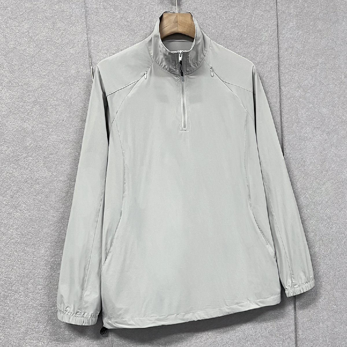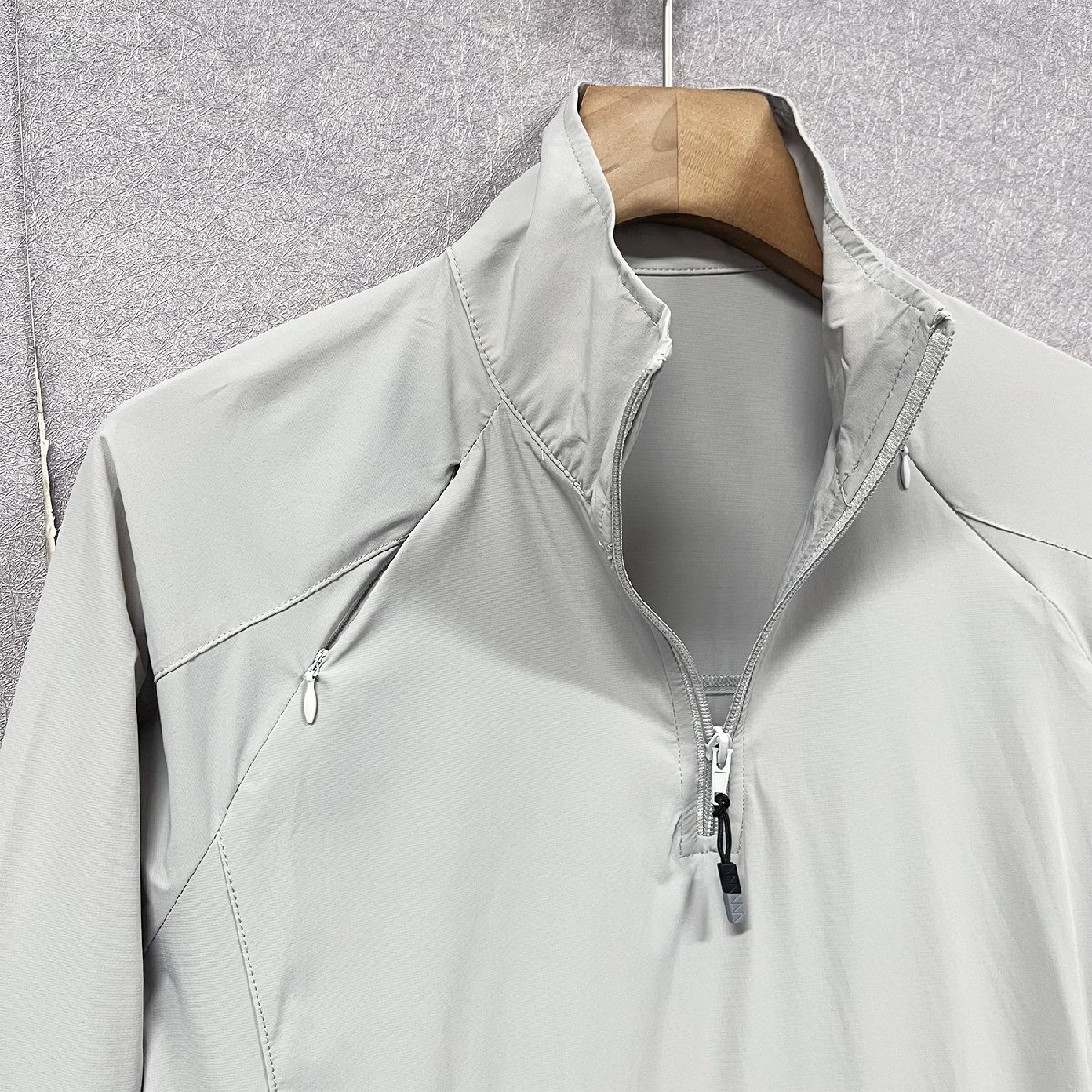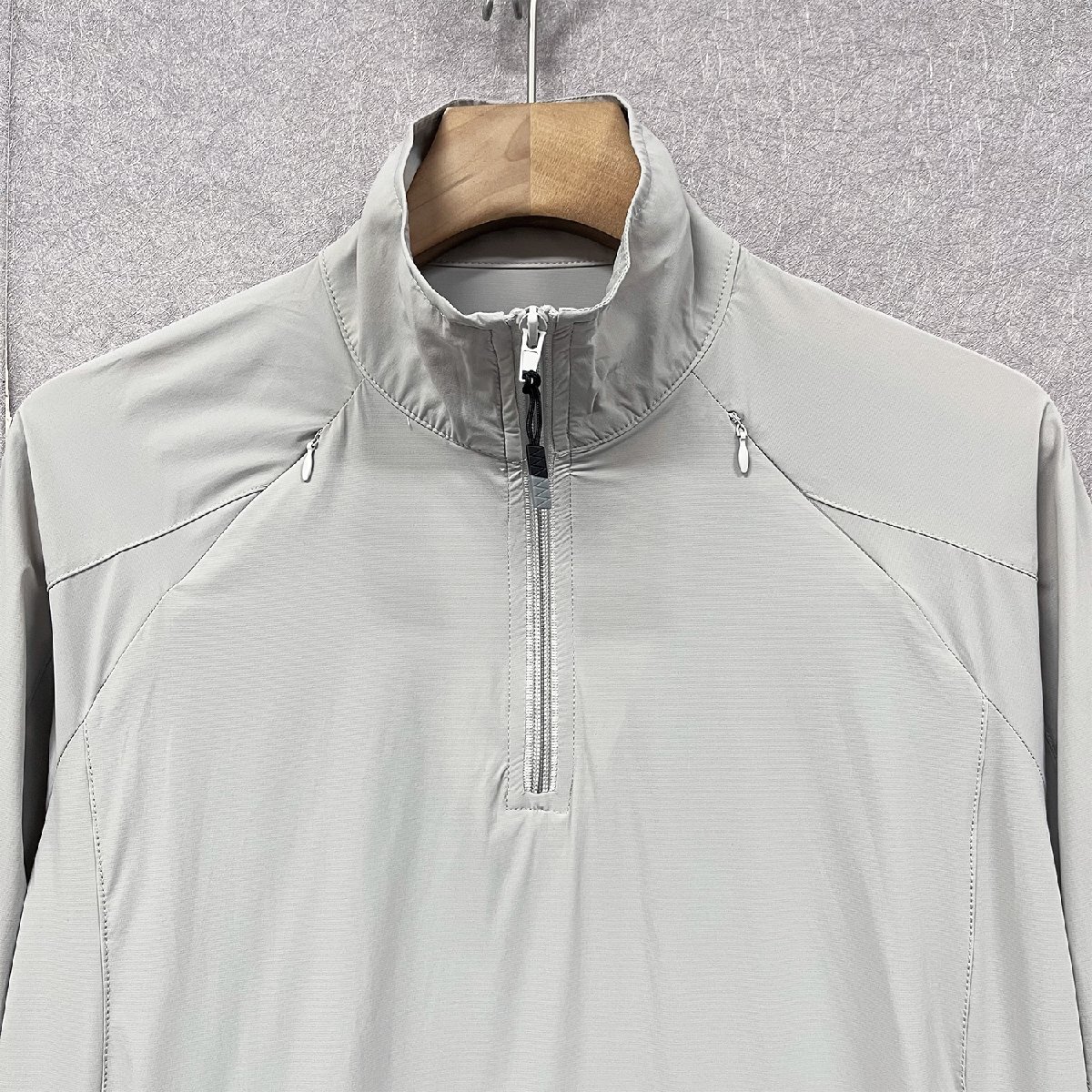 立ち襟のデザインはシンプルでおしゃれなうえ、防風性があり、首元の日焼け対策にも効果的です。ハーフジップ仕様で、着脱しやすく、日差し対策にも最適。サイドポケットは、ランニングや外出時に小物を持ち運ぶのに便利です。