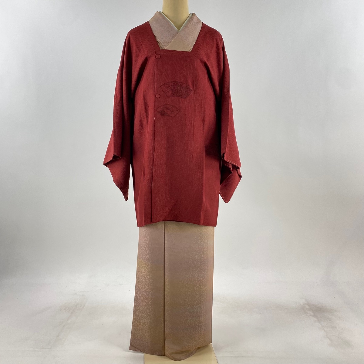 | 道行 美品 秀品 和装コート 角衿 扇面 草花 刺繍 赤茶 身丈86 裄丈66 M 正絹 【中古】 |