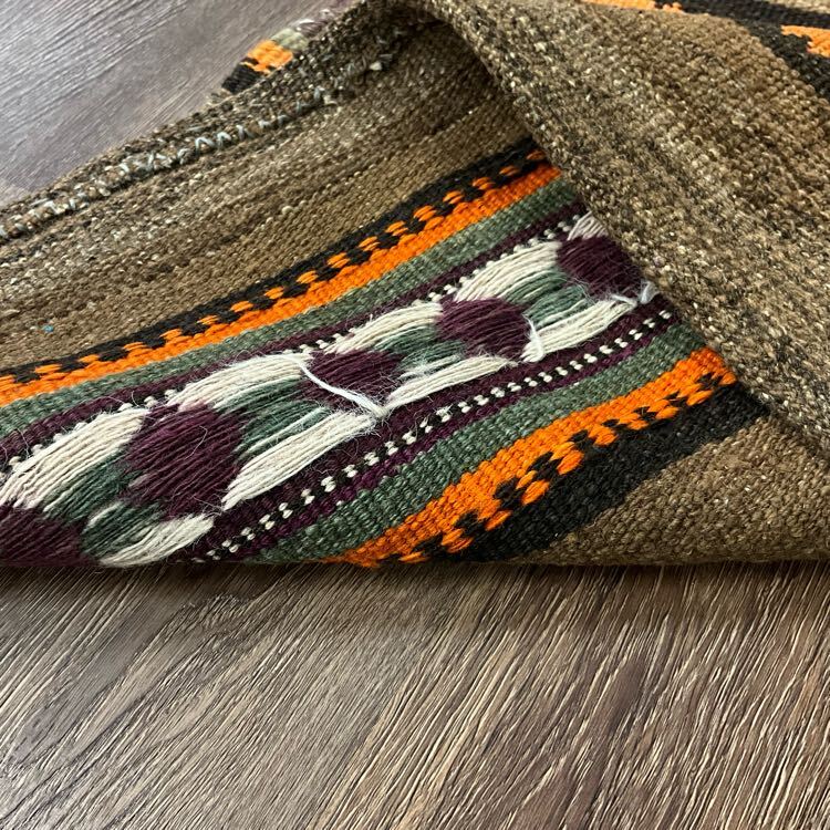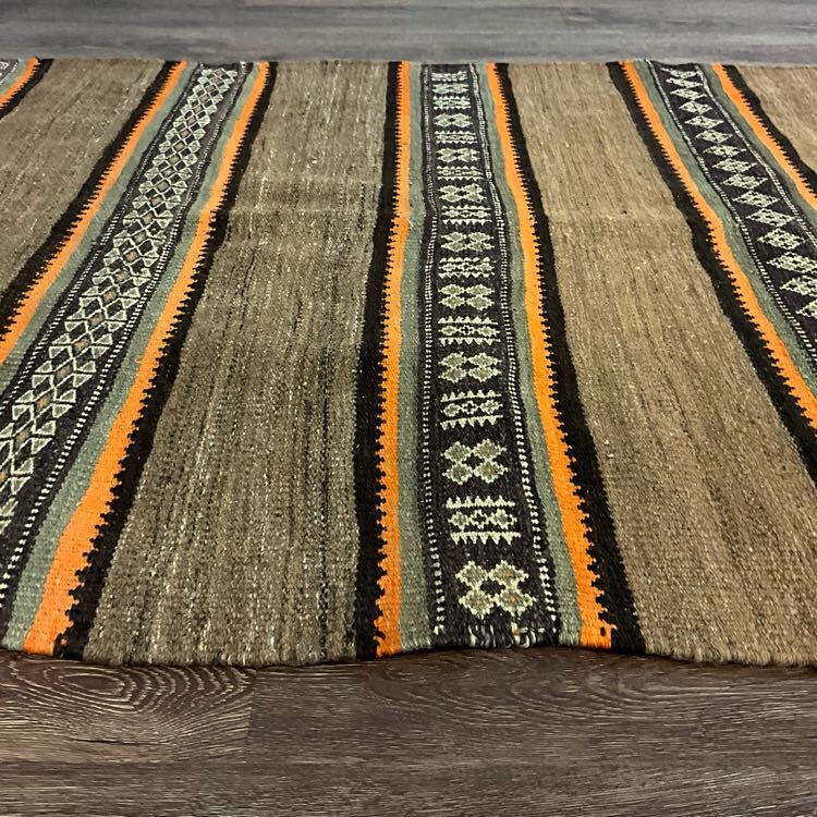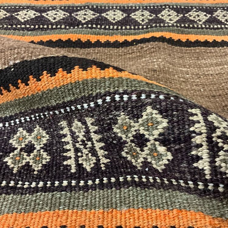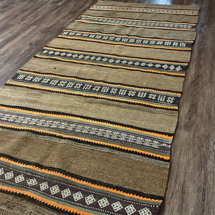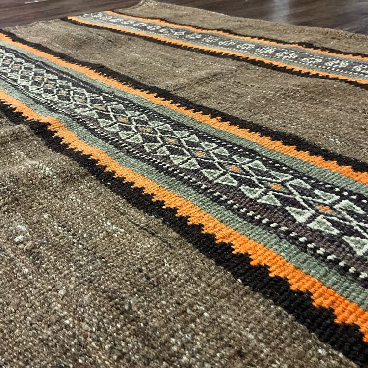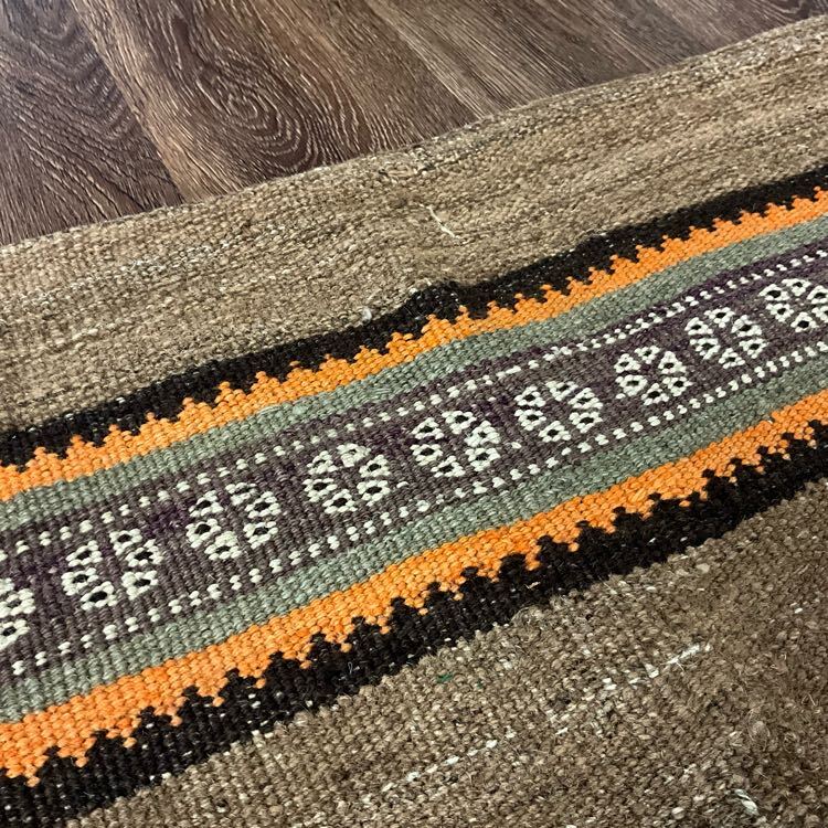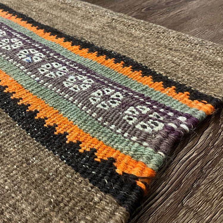 ★大型キリム★上部中央などに経年による擦れがございます。素朴なムラ感のあるブラウンベースに、刺繍のように表現された細かな織り柄が並ぶボーダーデザイン、ハンドメイドのぬくもりを感じるオススメの一枚です。遊牧民の生活文化に欠かせないキリム。平織りのキリムは肌離れが良く、屋内だけでなくアウトドアでご使用いただいても雰囲気抜群です。(画像をご確認ください。) (ハンドメイド特有の歪みがございます。)