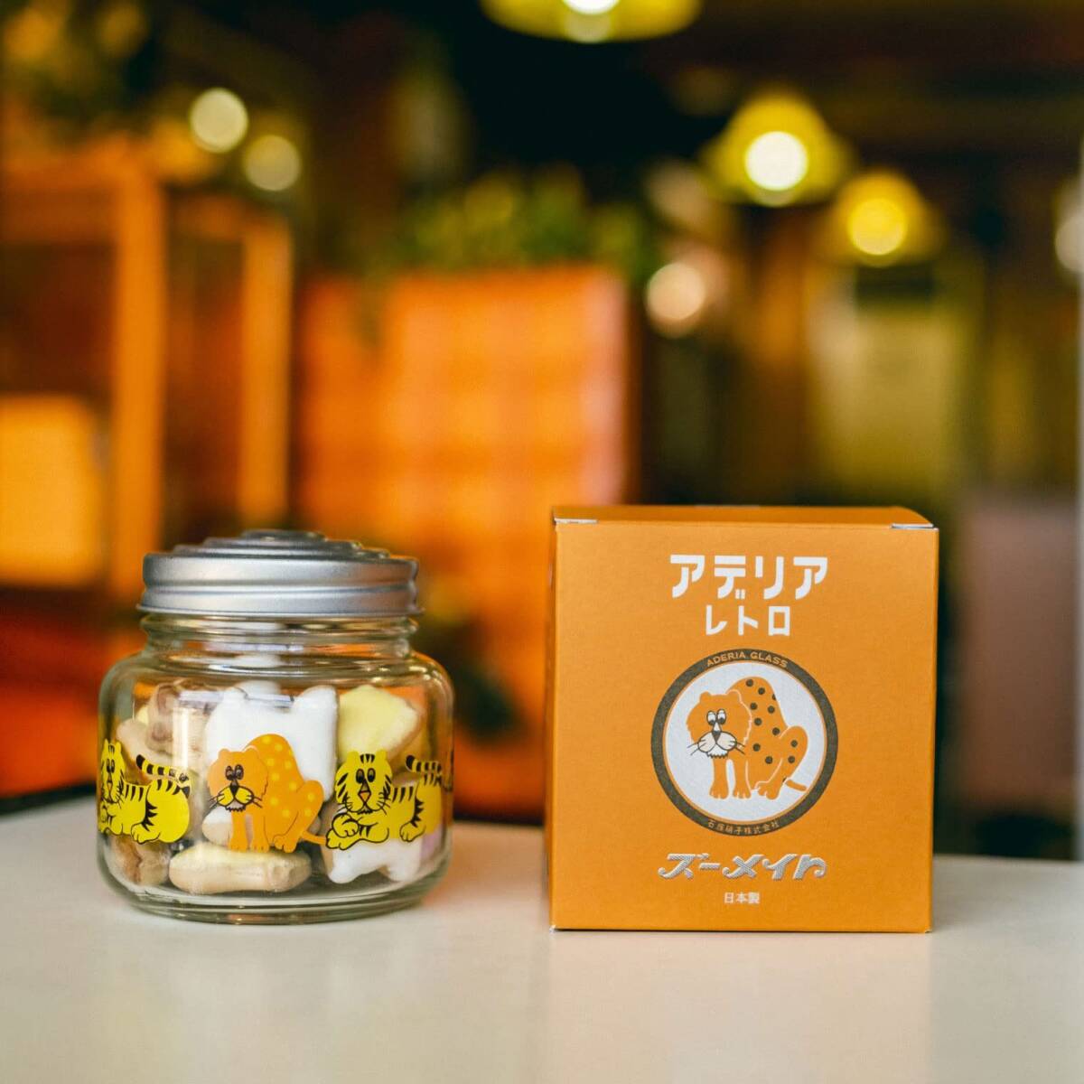 [アデリアレトロとは] 「アデリアレトロ」は、かつて昭和の家庭で使われていたアデリアのグラスウェアを、現在でも安心してお使い頂ける様にリメイクしたシリーズです。 アデリアの食器は親しみやすいデザインと手ごろな価格で広まり、昭和の食卓を飾りました。 その懐かしさと温かみある魅力に惹かれ、生産が終了した今でも当時のグラスや容器を大切に使い続けているお客様もいらっしゃいます。 そんな人々の声に後押しされアデリアレトロは誕生いたしました。 [ズーメイトシリーズとは] 昭和51年(1976年)に発売された動物柄のガラス食器です。 発売当初はお菓子を入れる容器として販売されていました。 花柄が主流の当時にあって珍しい動物柄のデザインです。 眠そうなヒョウとおとぼけ顔のトラがかわいらしいチャーミングな表情が特徴です。 [ボンボン入れ] 昭和の家庭で「ボンボン入れ」と呼ばれて親しまれていたガラスの卓上保存容器。 一口サイズのキャンディーやチョコレートを指す「ボンボン」を保管するためのガラス容器として開発・販売されていました。 もちろん、お菓子だけでなく、ステーショナリーグッズ、ヘアゴム、等小物を入れても可愛いガラスの保存容器です。 パッケージは、カラフルな色使いとグラスを連想させるデザイン。プレゼントやギフトにもお使い頂けます。 [サイズ]約最大径9.1(口径6.5)×高さ9.5cm [素材・材質]びん=ソーダガラス、蓋=ブリキ [生産国]日本
