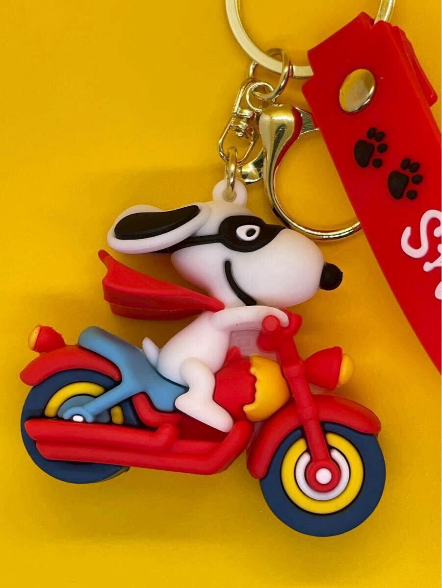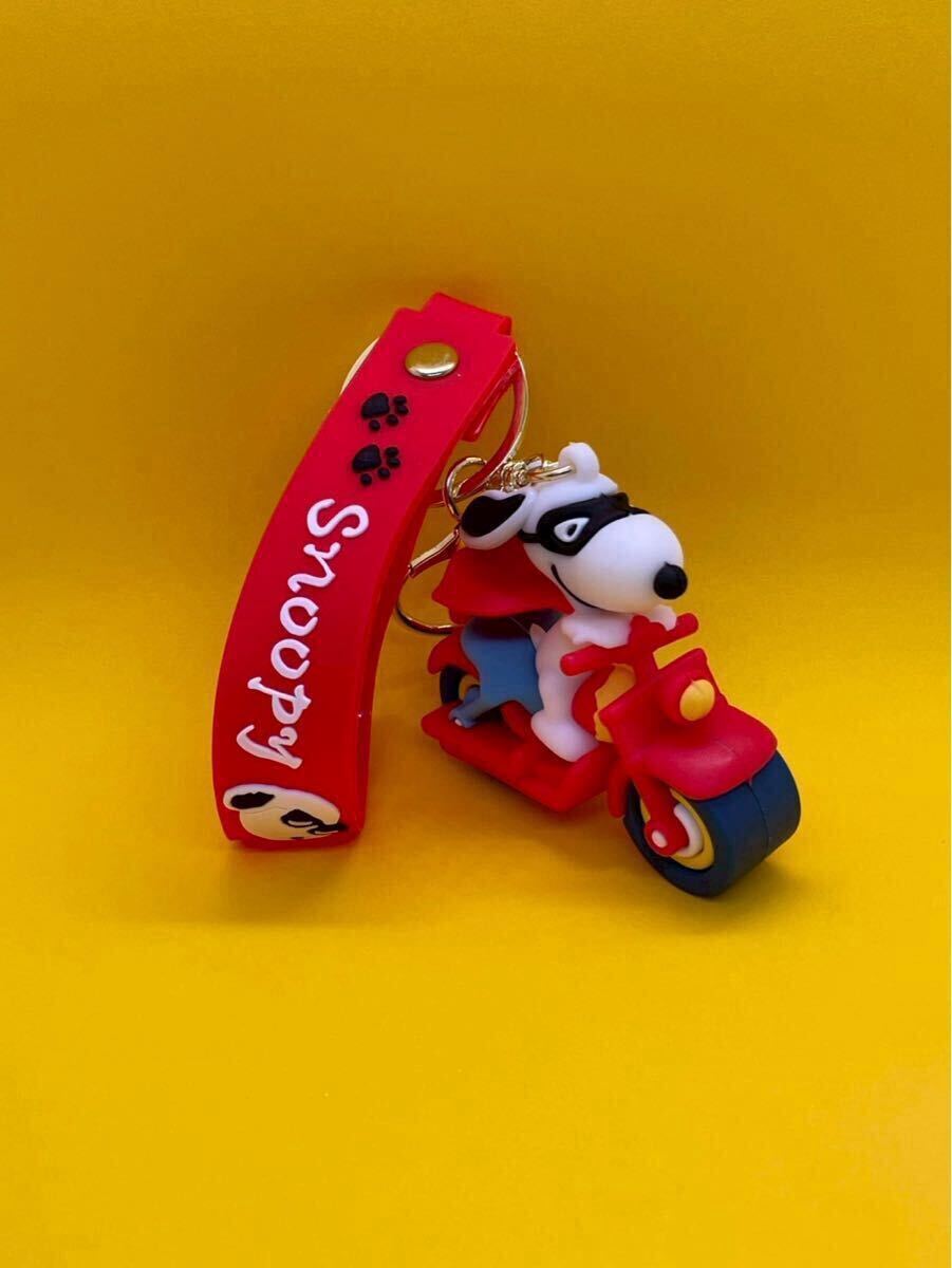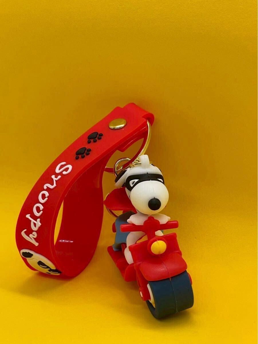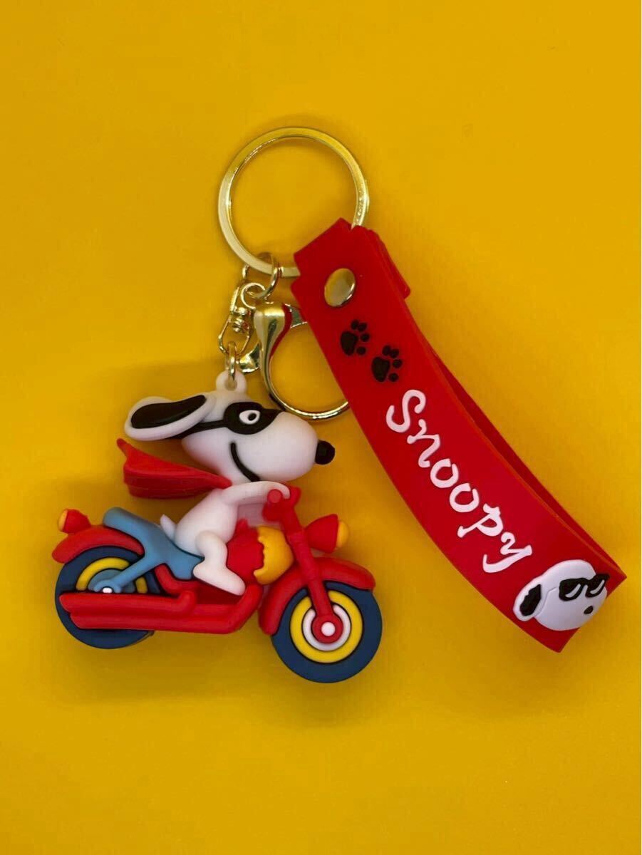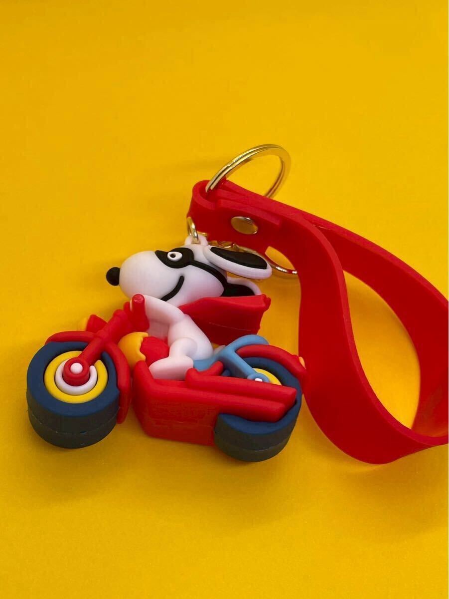 バイクに乗ったスヌーピーのシリコンキーホルダー、レッドストラップ付きで可愛らしいデザイン。