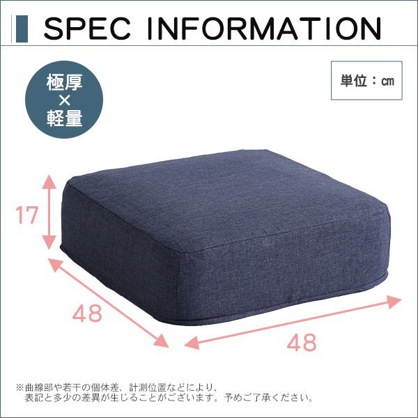 | 【カラー】 ベージュ、ブラック、ブルー、ブラウン、グリーン、グレー、ライトブルー、レッド 【サイズ】 W48xD48xH17cm/個 【重量】 1.5kg/個 【素材】 中材:ウレタンフォーム カバー:表地ポリエステル100% 裏地ポリエステル100% 【梱包】 サイズ:W44xD40xH48cm、重量:3.5kg 【その他】 日本製(カバーは中国製) 【完成品】 カバーはお客様取り付けです。 【ご注意】 ・サイズ、重量は概算です。 ・商品カラーはご使用のモニターによって実際の明るさや色と異なって見える場合がございます。 |