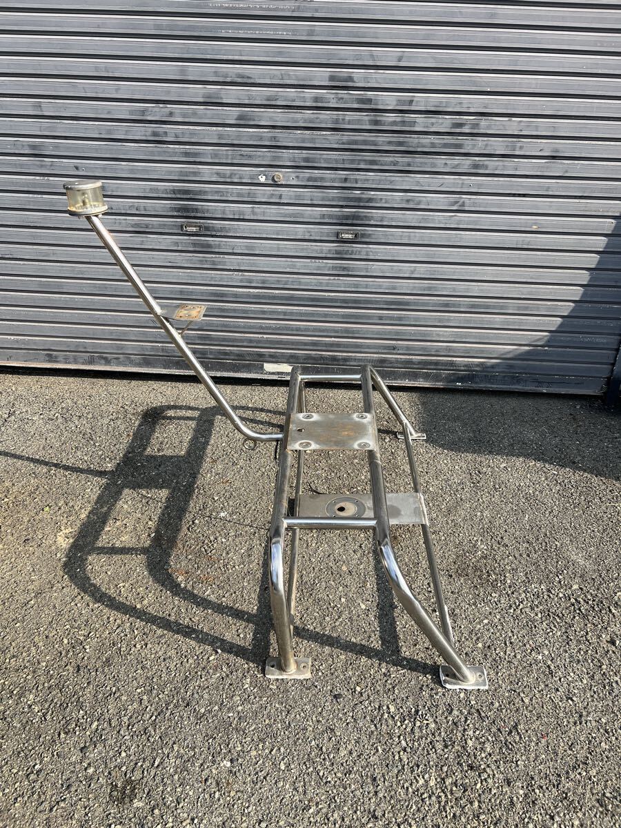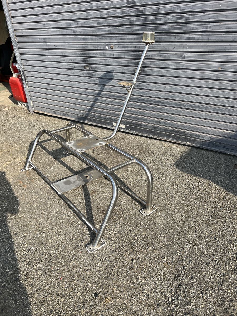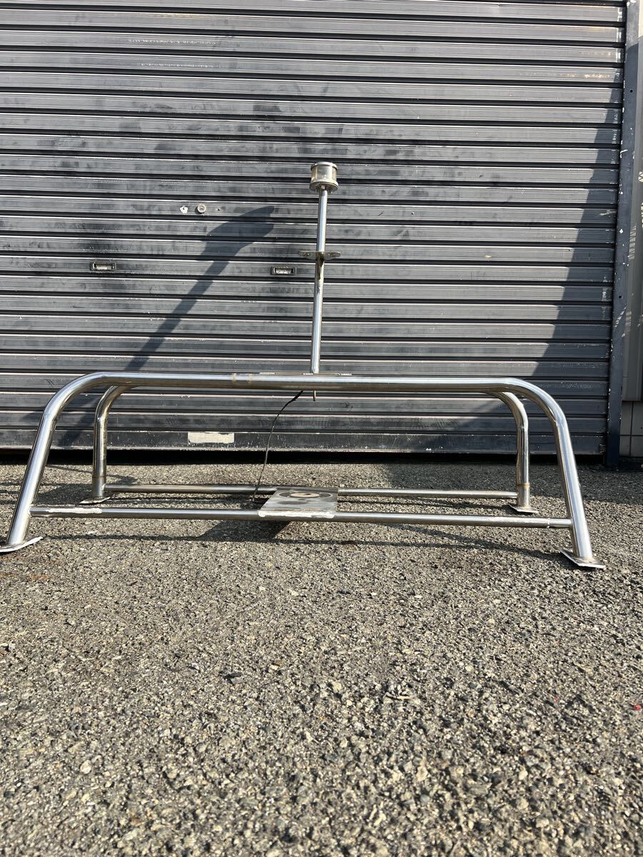 ヤマハYF27にて装着,使用していたステンレス製レーダーアーチです。停泊灯、コンパスアンテナ、レーダー、サーチライトを取り付けて使用していました。足元4箇所の取り付け部分は屋根のアーチに合わせて若干の角度がついています。落書き程度の寸法図を載せていますが、必要な箇所があれば質問にて問い合わせください。寸法図単位はおおよその数値でcmとなります。参考程度にしてください。