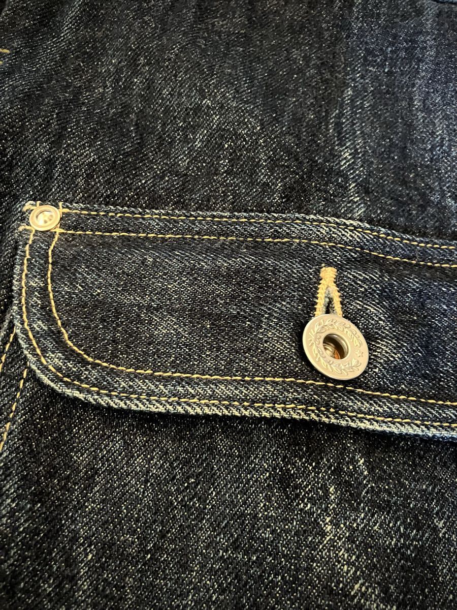 ボタンはオリジナル鉄製ワンスター(月桂樹)ボタン、リベットはMADE IN USAの銅メッキ鉄製UFOリベットを採用。