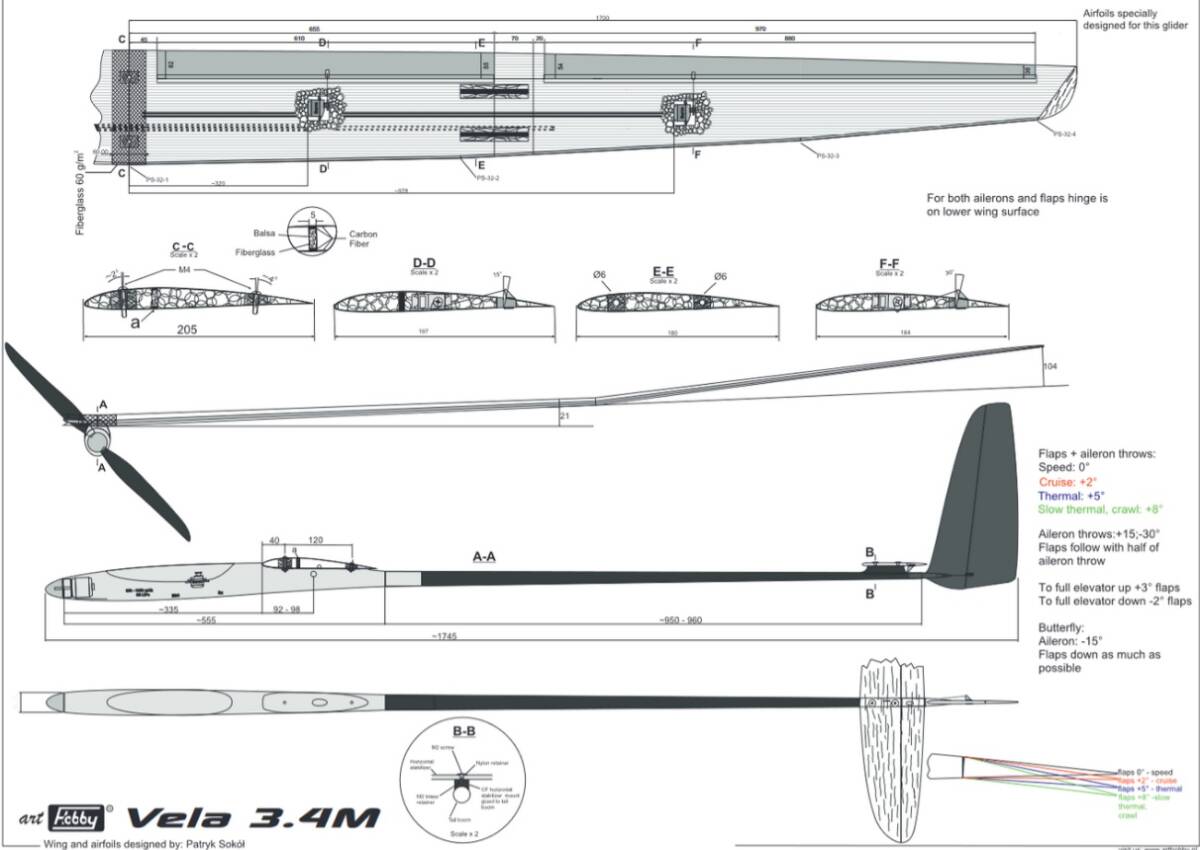 Wing span:3400mm、Length:1745mm、Wing area:57.20dm2、Glider weight:1350g(カタログ値)、Wing profile:PS-32-1; PS-32-2; PS-32-3; PS-32-4