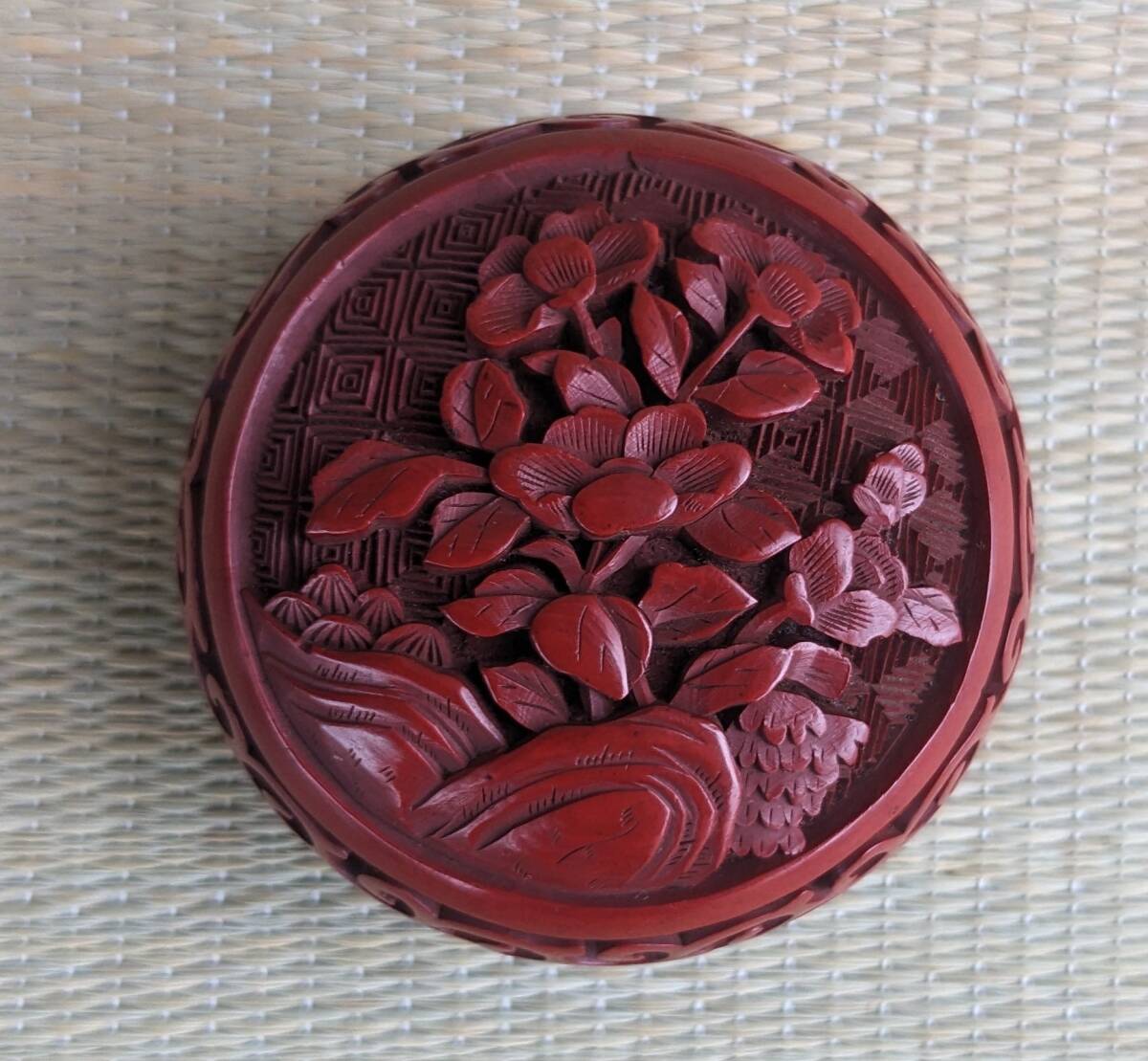 [雅] 未使用 《堆朱香合》中国製 中国で購入 草花文 唐草模様 内青地 茶道具 床飾り 炭道具 釜敷 七宝