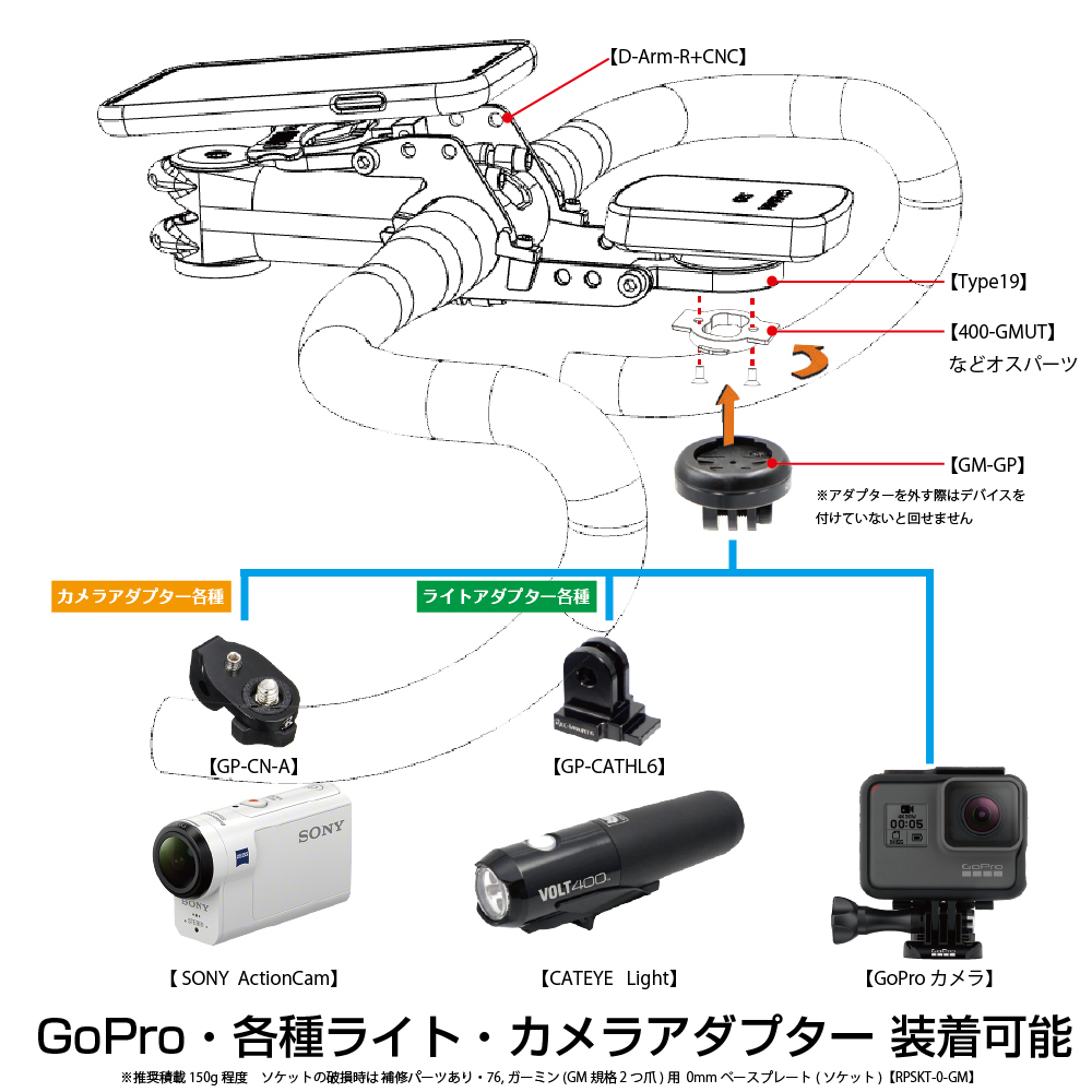 レックマウント製 GPで始まるライトアダプター・カメラアダプターの装着が可能。