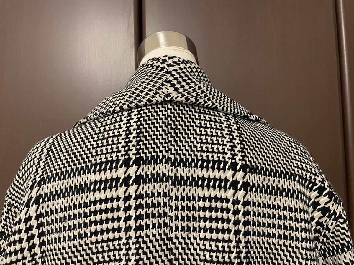 デプレ DES PRES のショールカラーチェックコートです。黒白ベージュ色のミックスで幾何学チェック柄。サイズ36、9〜11号くらい。素材は、ナイロン・ウール・ポリエステル、裏地キュプラ。幅約55㎝(外側ボタンで留めた場合約48㎝)、丈約90㎝。内側4・外側2のダブルボタン。両サイドポケットあり。数回着用してます、気になる方はご遠慮ください。商品以外のアクセサリー・インナー・ボトムは含まれません。