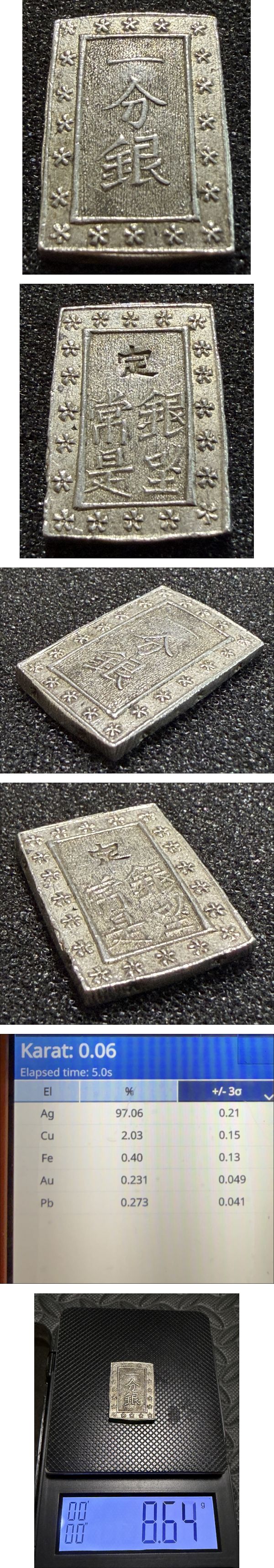 | 商品説明 | 【商品内容】 希少【本座 天保一分銀 Pt 両面額縁様 】 【両面額縁様】です。 両面額縁様は、私の感覚だと100枚中1~2枚程度しかないのかなぁと感じます。 【品位】 銀97.06% 金0.231% OLYMPUS VANTA 蛍光X線分析計機 (約400万円)で測定。 鑑定結果は写真に掲載しています。 【量目】:8.64g 【状態】: 銀座オークションにて落札した一分銀です。 【本座 天保一分銀 Pt 両面額縁様 】となります。 コンディションは写真でご判断ください。 現状で気に入っていただける方のみお願い致します。 計量器は安価な物ですので多少の誤差はあると思います。 発送は【おてがる配送ゆうパケットポスト】を選んでいただき コインホルダーに入れ、プチプチに包み さらにプチプチ付き封筒に入れて発送いたします。 ◆あくまで個人保管品です。 画像にてご判断いただき、ご納得いただける方のみご入札をお願い致します。 また画像には限りがございますので、色味が異なる場合などあるかもしれません。 詳細部分にこだわる方、完璧をお求めになる方、状態に神経質な方もご遠慮願います。 商品状態に関しては個人差がございます。 落札後の商品状態による返品や故障時の補償は一切お断りいたします。 (すり替え防止の為) ◆不要なトラブルを避けるため、3日以内のご決済、 速やかな受け取り連絡をお守り頂ける方のみとしております。 あらかじめご了承ください。 お守り頂けなかった場合、落札者都合キャンセルとさせていただきます。 以上、全てをご了解いただける方のみご入札をお願い致します。 ■新規の方及び、評価が低い方の入札は取り消させていただく場合がございます。 ■領収証の発行は対応しておりません。 |