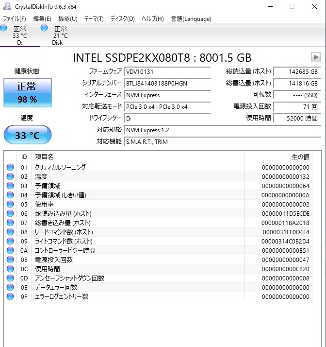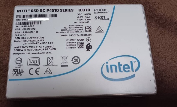 その12 Intel SSD DC P4510 SERIES 8TB 使用52000時間 電源71回 NVMe 2.5 U.2 中古 送料込み