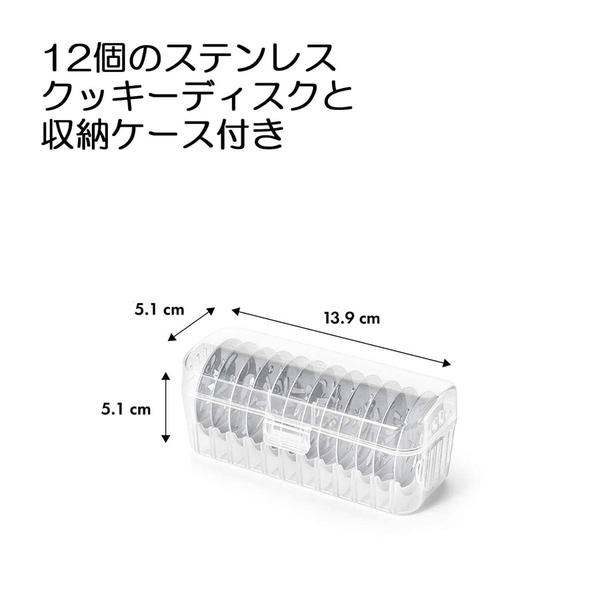 大きく持ちやすいレバーでたくさんのクッキー作りでも疲れにくく、滑りにくい底面が生地を押し出す際にもしっかり安定しますレバーを押すだけで楽しく簡単に均一サイズ、形のクッキーができる大きく持ちやすいレバーでたくさんのクッキーを楽しく作れる生地を入れてレバーを押すだけ12種類のディスク(型)がセットディスクには、保管時も便利なケース付きディスク:雪の結晶/ハート/キンポウゲ/貝殻/リース/ツリー/ひまわり/デイジー/百合紋/ベア/リーフ/チョウチョ