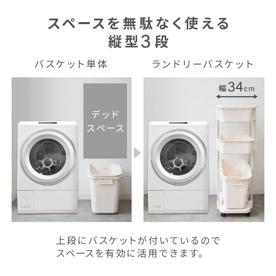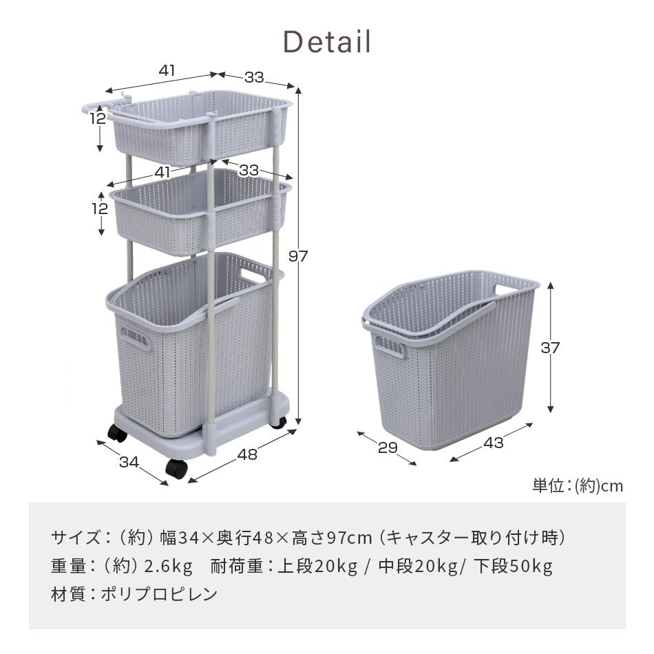 スペースを無駄なく使えるタテ型タイプです。 さらに!スリムなボディなので、コンパクトなランドリールームでも省スペースで使えます。 上段と中段の浅バスケットにはバス用品、洗濯機まわりの小物が収納できます。 入浴時の着替えや脱衣カゴとしても重宝します。 下段のバスケットは大容量の深型タイプ! 安心の耐荷重で、たくさん入れても大丈夫です。 \その他、おすすめポイント/ ・移動しやすいキャスター付 ・目隠しと通気性を兼ね備えたメッシュデザイン ・上段カゴにはタオルバー付 ・下段カゴは取り外して持ち運べる持ち手付 【商品仕様】 カラー:グレー サイズ:(約)34×48×97cm(組立式) 重量:(約)2.6kg 耐荷重:(約)上段20kg / 中段20kg / 下段50kg 材質:PP(ポリプロピレン) ※商品は、モニターによって色合いが異なって見える場合があります。 ※仕様・デザインは改良のため予告なく変更することがあります。 (洗濯かご 洗濯物入れ かご カゴ 洗面収納 バス用品 洗濯用品 ランドリー バスケット 小物整理 分別 サニタリー バスルーム 洗面台 かわいい 人気 おすすめ WEIMALL) |