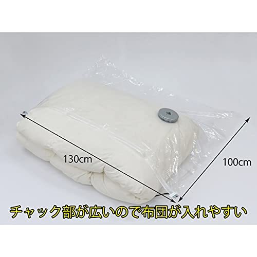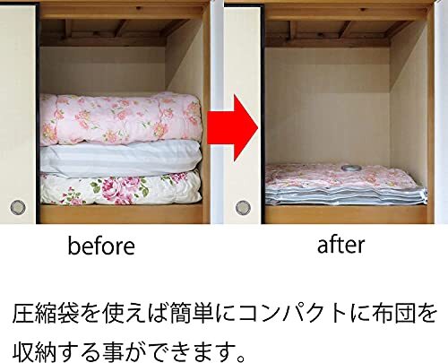 商品紹介 大きめのふとんに適したLサイズの圧縮パックです。 吸引力不足だった充電式スティック掃除機でも圧縮できます。 大きなやわらか弁で掃除機の様々なノズルにフィット!特殊形状にもOK! もともと吸引力のある普通の掃除機(キャニスタータイプ)では激速スピード圧縮!(※当社比) ※一部規定外の掃除機では圧縮できない場合があります。 バルブはふた付です。つまみやすい段違いカラーチャック。本体にスライダー付。 安全警告 【警告】 ●本来の目的であるふとんや衣類等の繊維製品以外に使用しないでください。(食品や動物へ使用しないでください) ●小さなお子様の手の届かない所に保管してください。圧縮パックをかぶると窒息の原因になります。 ●熱や火に近づけたり、釘・針・刃物等でキズをつけないでください。 【使用上の注意】 ●型くずれや、シワが気になるものへのご使用はお避けください。起毛処理(毛足の長いもの)衣類、毛皮、皮革製品、スーツ、シルク製品、また高価な衣類、厚みの回復率が気になるものへのご使用はお避けください。 ●圧縮パック内には脱酸素剤や除湿剤(シリカゲル)以外の薬剤(防虫剤・防カビ剤等)を入れないでください。収納物の一部に効果が集中し、変色・変質する場合があります。 ●本品はダウン70%以上の羽毛製品にもご使用いただけます。但し、羽根製品やフェザーの多い羽毛製品のご使用はお避けください。(羽根自体が折れて収納物の厚みが戻らなかったり、圧縮パックをキズつけ、空気もれの原因になります) ●羽毛製品は水鳥の毛を使用している為、収納物がムレることにより羽毛の臭いがする場合があります。この場合、羽毛製品を陰干しし、臭いが消えてからご使用ください。 ●収納物の種類・材質・使用状況・収納する量により、圧縮率・回復率が異なったり、圧縮しにくい場合があります。 ●弁を引っぱらないでください。またチャック部分を絶対に折らないでください。変形により空気もれの原因となります。 ●チャック部分に繊維やゴミ等の異物が挟まると空気もれの原因となりますので、チャック部分の内側を湿った布で軽く拭いてからチャックを閉じてください。(布の水分が多いとカビの原因となりますので布はよく絞ってください) ●圧縮パックを引きずったり、放り投げたりしないでください。 ●圧縮保存期間はをめやすにしてください。をこえると圧縮率が低下したり、収納物の回復率が低下することがありますので、長期間保存される場合は、位で一度取り出し、厚みを回復させてから再度ご使用ください。 【掃除機についての注意】 ●充電式の掃除機は予め満充電にしてからご使用ください。また、圧縮作業を連続して2枚以上行う場合は、充電切れにより吸引力が低下して時間がかかったり、止まったりすることがありますので、充電残量を確認しながら作業してください。 ●必ず掃除機内のゴミを捨てておいてください。ゴミが多いと吸引力が低下してモーターに負担がかかり故障の原因になります。 ●本品のバルブは掃除機に負担がかかりにくい構造になっていますが、万一掃除機が止まった場合は(コード付の掃除機はコンセントからプラグをぬいて)30分以上熱をさましてから再度圧縮してください。