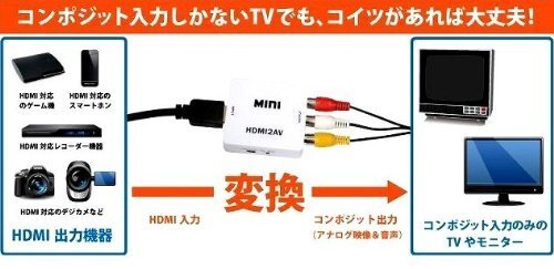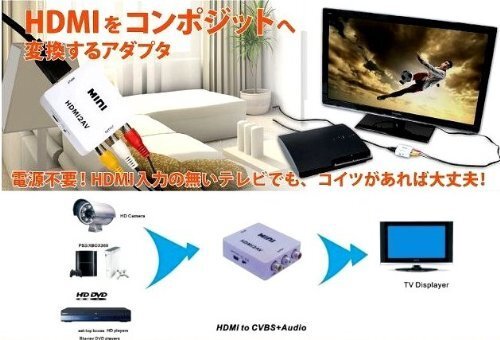 | コンポジットしかない(HDMIが無い)TVでも、コイツがあれば HDMI出力に対応したゲーム機やスマホ、レコーダーの映像を映す ことができます! もちろん音声出力もできます!例えば、PS3の映像を出力したり 渾身のゲームプレイを録画したり…なんてことが可能になります! HDMI入力をコンポジット出力へ変換するコンバーター ドライバや電源が不要!接続するだけでOK! HDMI端子が無い古いテレビでも、コンポジットがあれば 大丈夫なんです!HDMI出力に対応したゲーム機やスマホなど から、テレビへアナログ映像&音源を出力できます! 眠っていたTVをサブモニターとして蘇らせましょう! |