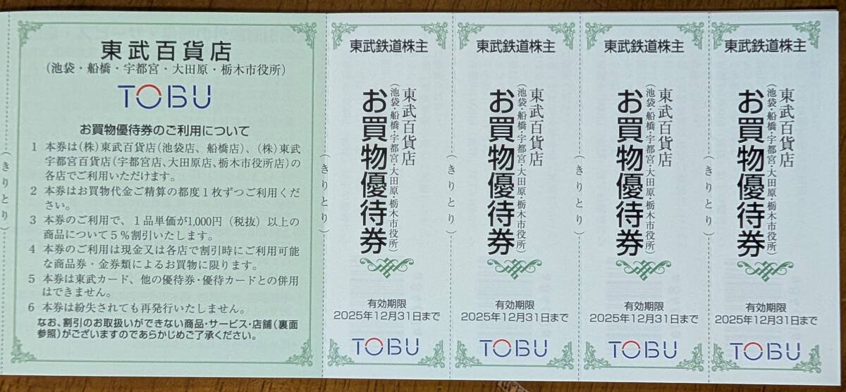 東武鉄道 株主優待 東武百貨店 お買物券4枚です。
