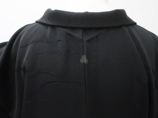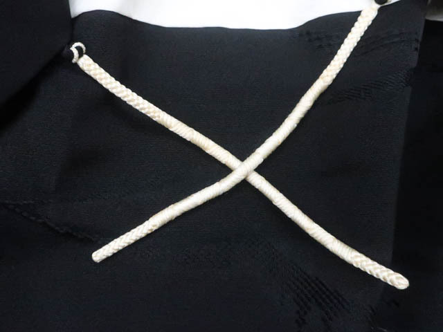 リサイクル商品のため、左後身後裾、紐に汚れがございますが着用可能なお品です。 地色は黒です。 1枚目の画像が近いお色かと思われます。 素材は正絹です。 |