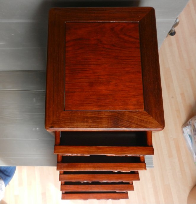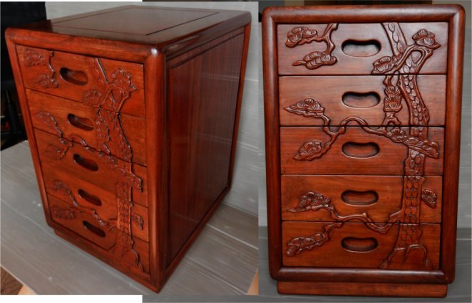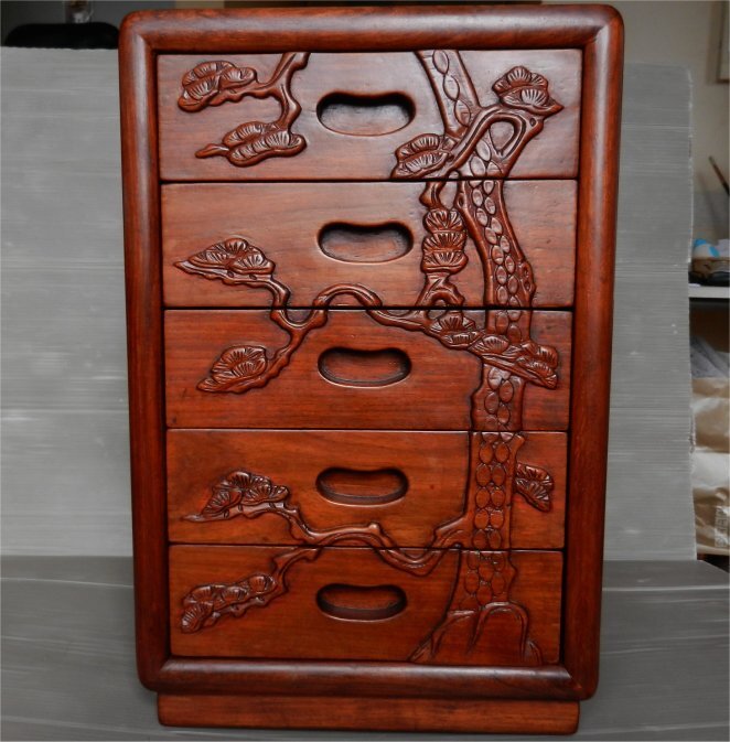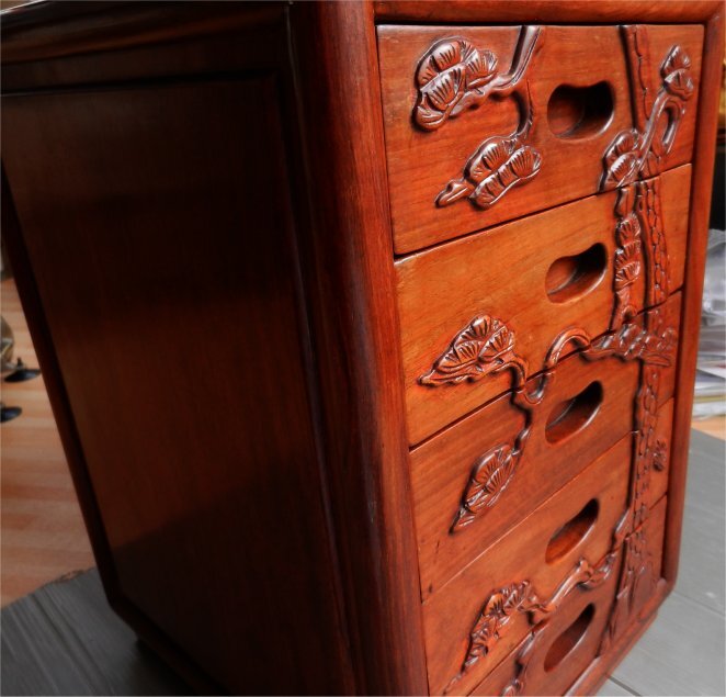 | ☆希少!唐木 花梨(かりん) 無垢材 老松 レリーフ彫刻 小引き出し 5段 チェスト 小物入れ コンパクト 飾り台 レトロ | ||||||||||||||||||||