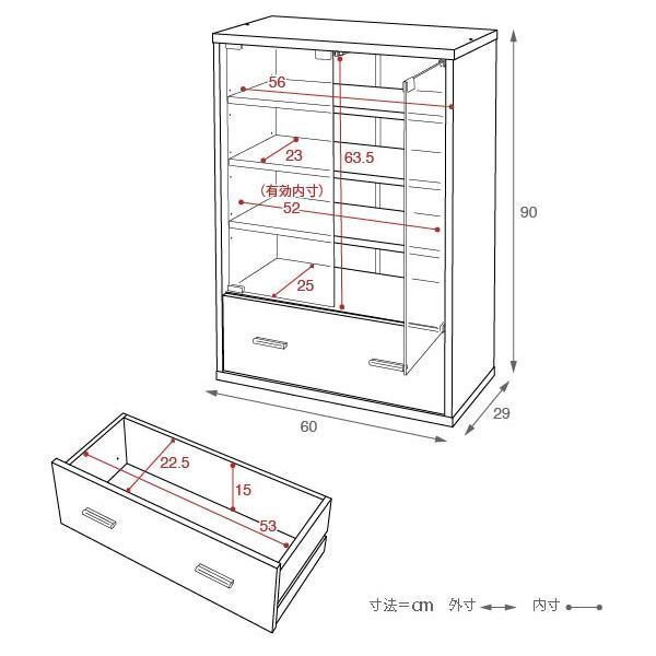 | 【カラー】 ホワイト、ナチュラル 【サイズ】 <外寸> 幅60×奥行29×高さ90cm <内寸> 扉内:幅52×奥行25×高さ63.5cm 引き出し:幅53×奥行22.5×高さ15(有効16.5)cm 可動棚:幅56×奥行23×厚み1.8cm(3.2cmピッチ3穴) 【材質】 本体:プリント紙化粧合板 ガラス:5mm厚強化ガラス 【生産国】 ベトナム 【梱包】 サイズ:93.2×33.9×22.6cm、重量:22.5kg 【その他】 可動棚:3枚 【組み立て品】 お客様による組み立てが必要です。 |