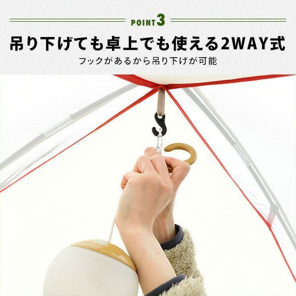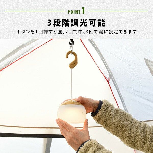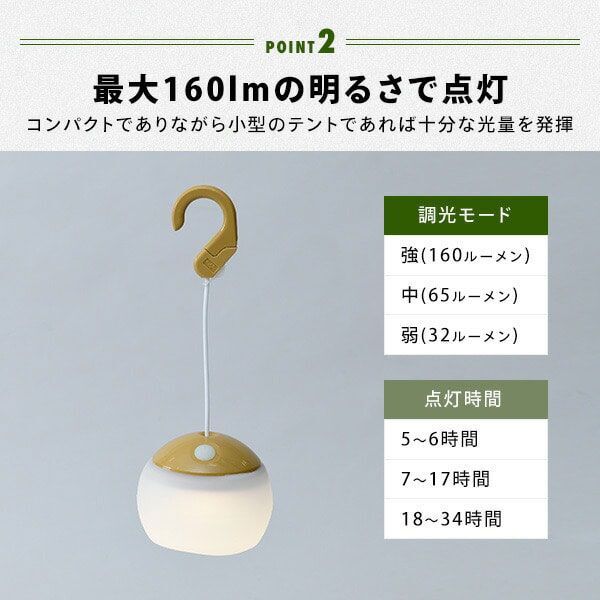 | 内 容 | ■キャンパーズコレクション LEDランタン 充電式 160lm 吊り下げ 3段階調光 ■型番:YGL-11(BR) ■サイズ:幅10.5×奥行10.5×高さ26.5cm ■重量:0.12kg ●3段階調光可能 ●防滴性能:IP4生活防水 ●明るさ:強 160lm、中 65lm、弱 32lm ●点灯時間:強(5-6時間)、中(7-17時間)、弱(18-34時間) ●バッテリー容量:2600mAh ●入力端子:USB ●電線ケーブルの長さ:125mm ●セット内容:本体、充電ケーブル、取扱説明書 ●ランタンのシェードは取り外しが可能 ●吊り下げ可能なフック付き ◆総額 7960円相当 |