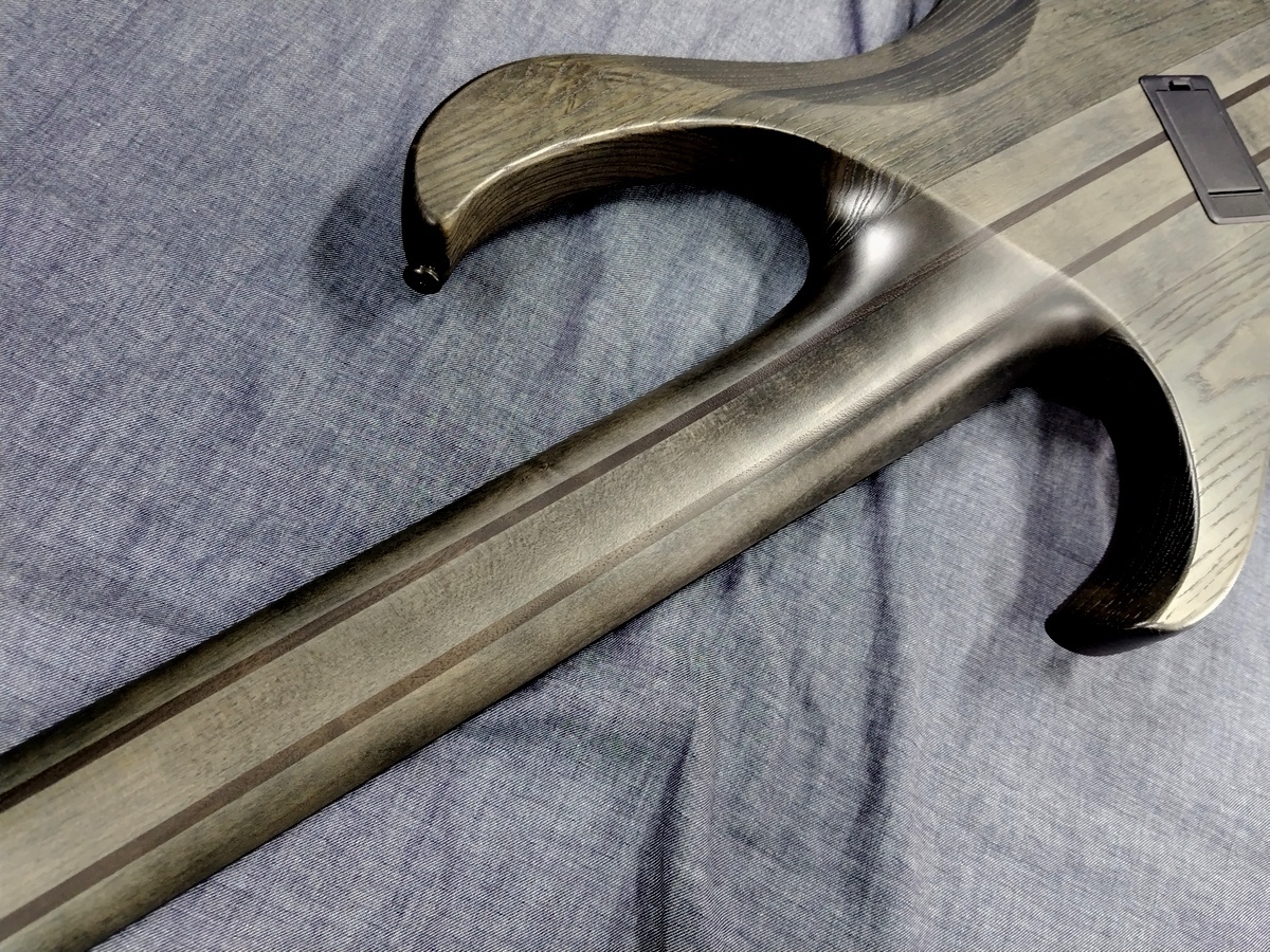 ネックをサンドする両翼のウイング・ボディは、抜けが良くクリアなサウンド特性のアッシュ材と中低音域特性に富むオコウメ材、さらに個性的なバール杢入のポプラ材をTOPへ貼り合わせた積層構造です。
