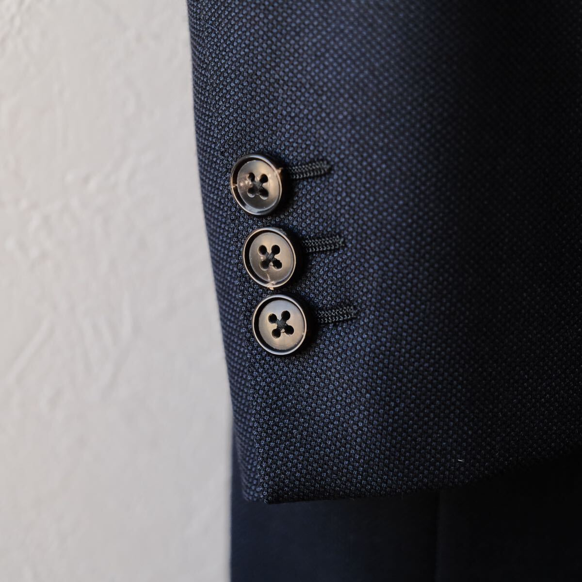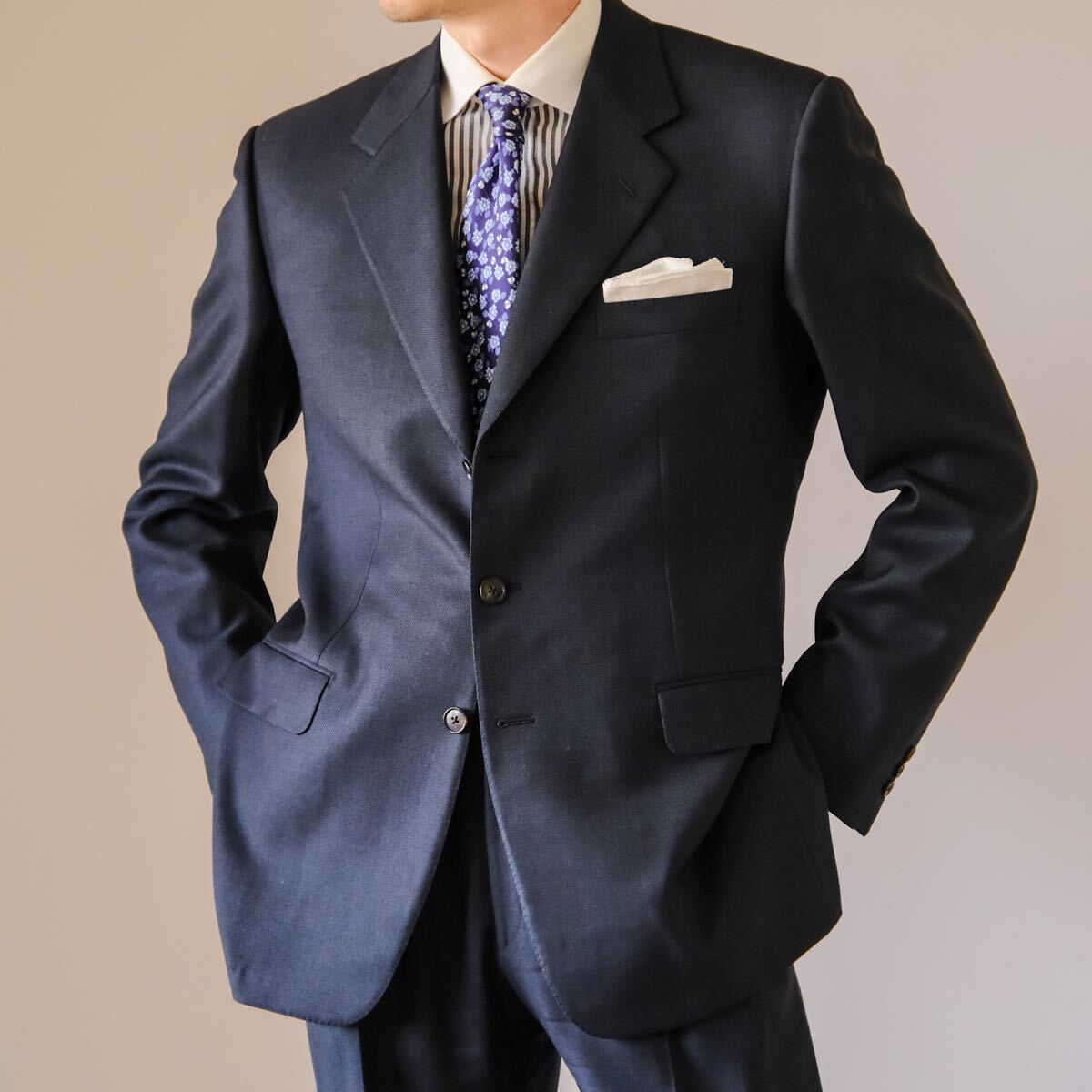 シンプルなビジネススーツとして使えますが、ベタっとしたネイビーではなく、バーズアイ柄で洒落が効いてます。