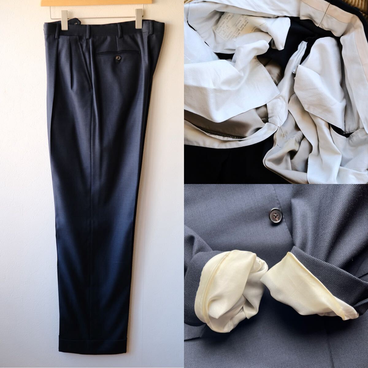 通常の着用感ございますが目立ったダメージはありません。ジャケット袖口裏地、スラックス裏地に薄いシミ汚れございますのでご確認お願いします。