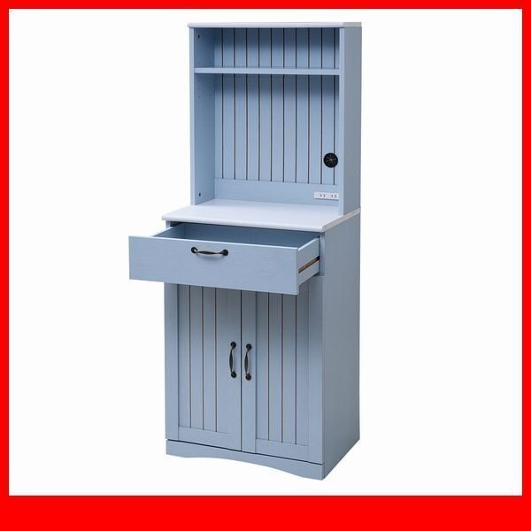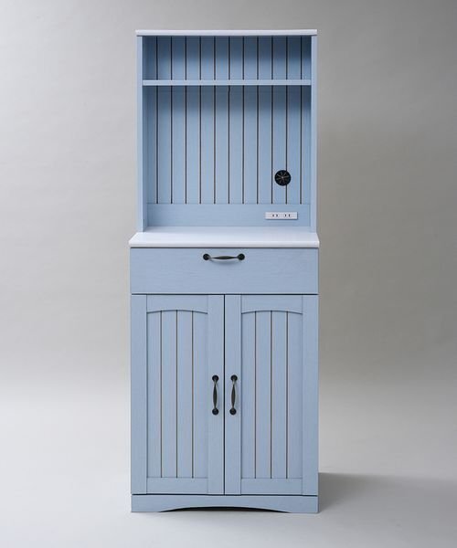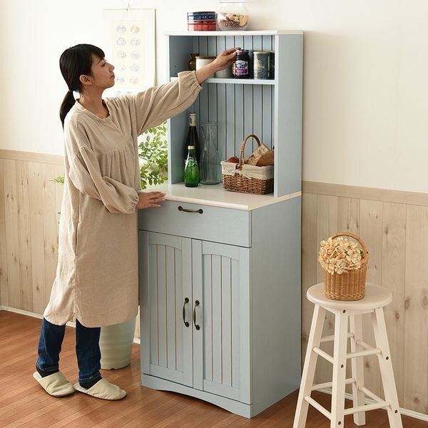 | バイカラーで魅せるフレンチカントリースタイルのカップボード。 コンパクトサイズなので一人暮らしにも最適です。 オープン部は2口コンセント付だから、トースターなどの調理家電の収納に便利。 上段には、可動棚があるので、調味料などの小物収納に最適。 下段は、引き出しと扉収納で、カトラリーから食器類をしっかり収納出来ます。 丸みを帯びたフォルムと、アンティーク調の取っ手といったディテールがカントリーテイストを漂わせます。 |