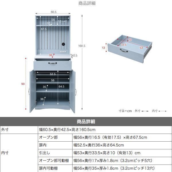 | 【サイズ】 <外寸> 幅60.5×奥行42.5×高さ160.5cm <内寸> オープン部:幅56×奥行16.5(有効17.5)×高さ67.5cm 扉内:幅52.5×奥行36×高さ64.5cm 引出し:幅53×奥行33.5×高さ10(有効13)cm オープン部可動棚:幅56×奥行17×厚み1.8cm(3.2cmピッチ5穴) 扉内可動棚:幅56×奥行35×厚み1.8cm(3.2cmピッチ13穴) 【材質】 本体:合成樹脂化粧パーティクルボード(ポリ塩化ビニル) 【耐荷重】 天板:(約)20kg以下 オープン部可動棚:(約)7kg以下 扉内可動棚:(約)10kg以下 引出し:(約)10kg以下 【生産国】 中国 【梱包】 2梱包でお届けします。 2-1 サイズ:74.5×45×18.5 cm、重量:18.5kg 2-2 サイズ:99×42×12 cm、重量:14kg 【その他】 ・可動棚:(オープン部)1枚、(扉内)3枚 ・合計1500W2口コンセント付/コード長さ196cm 【組み立て品】 お客様による組み立てが必要です。 |