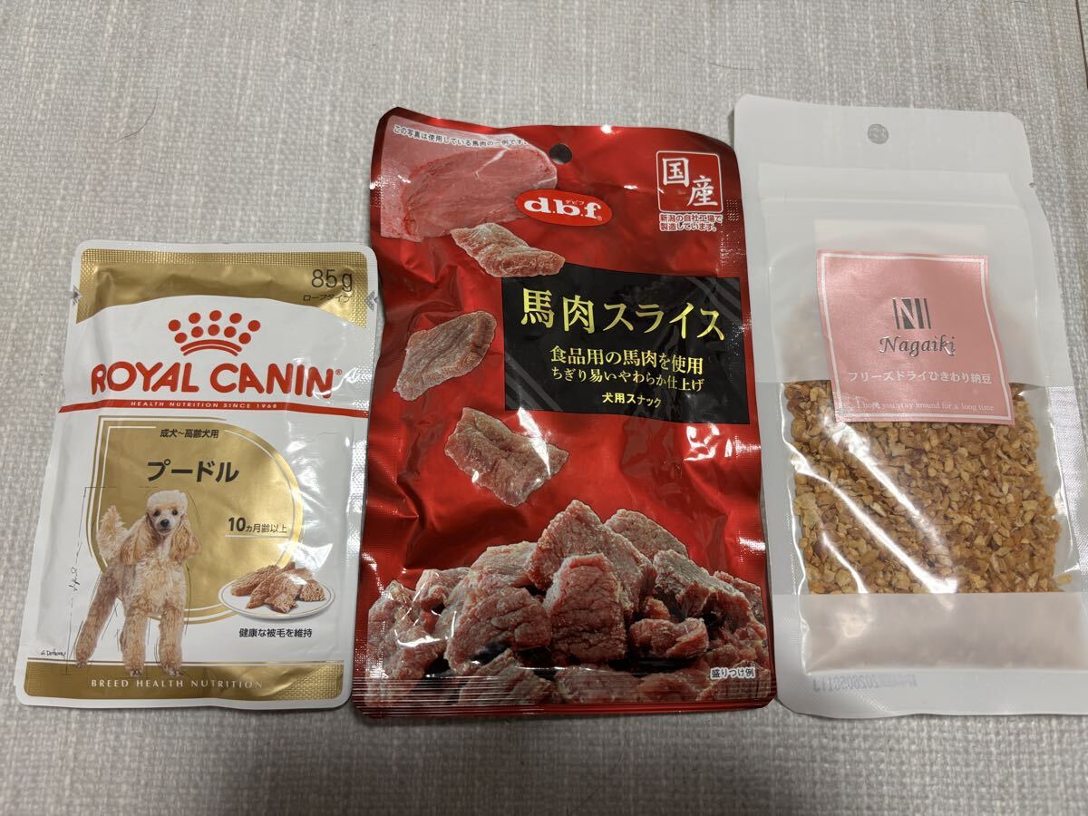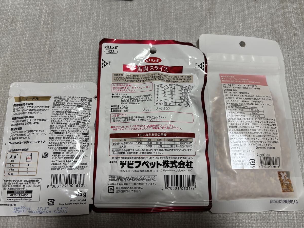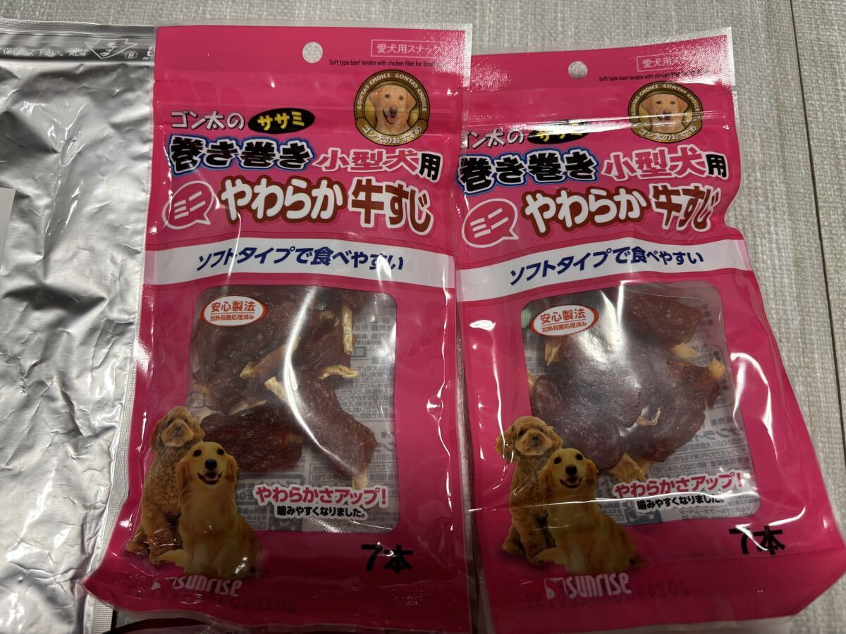 小型犬向けの柔らかいビーフおやつと、全犬種用のゴールドフード、馬肉スライスが含まれています。