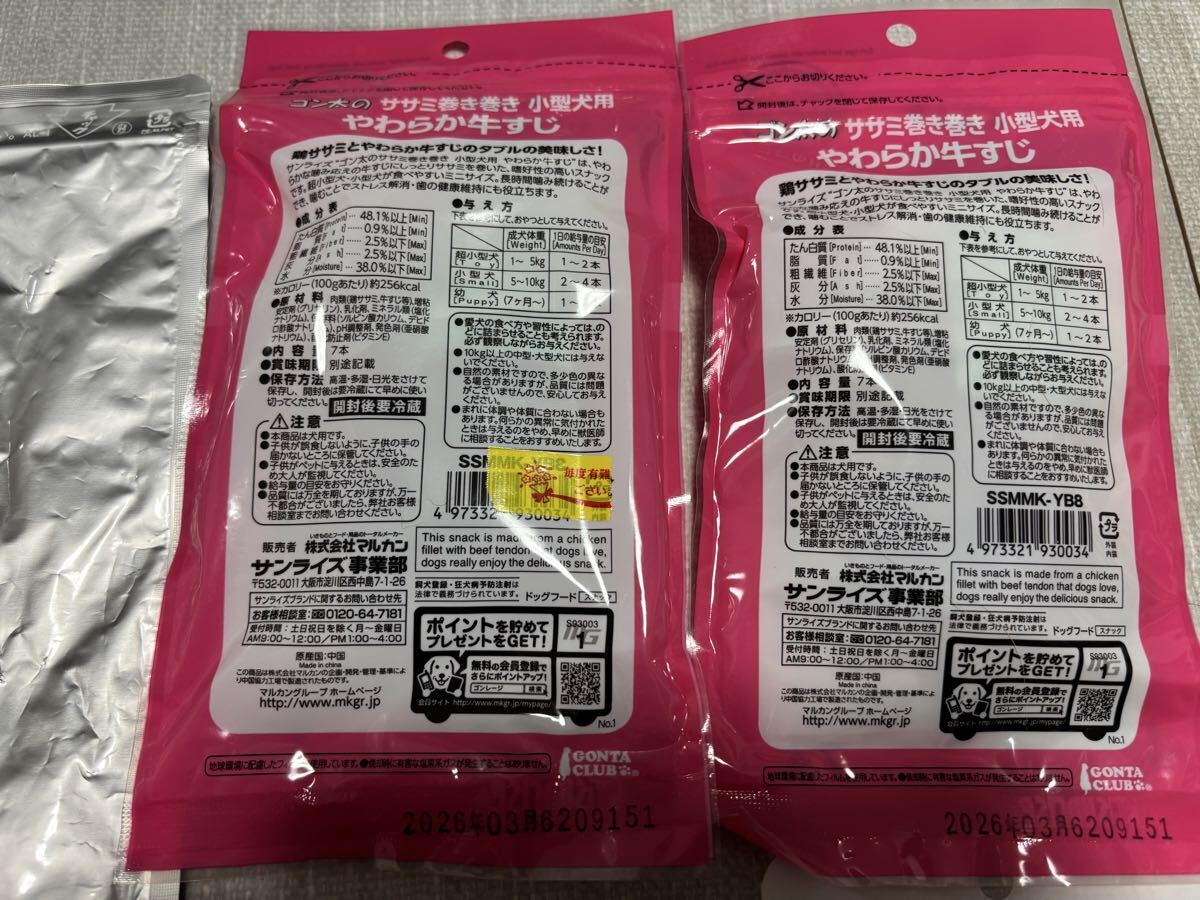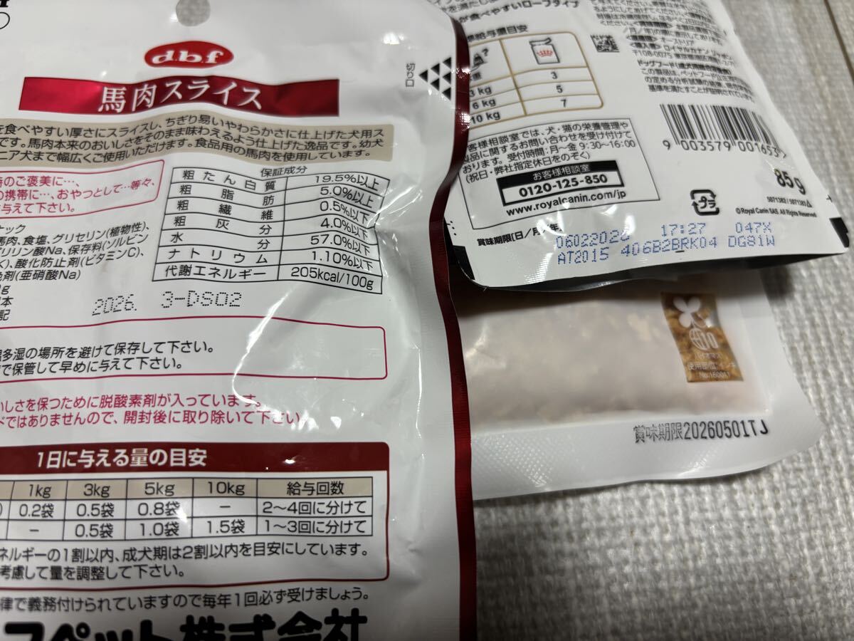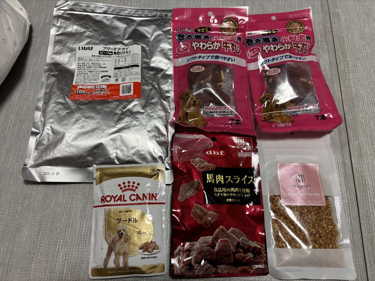 小型犬向けの柔らかいビーフおやつと、全犬種用のゴールドフード、馬肉スライスが含まれています。