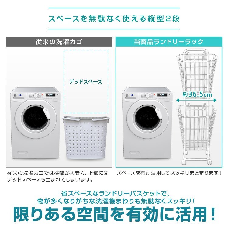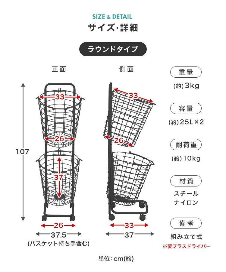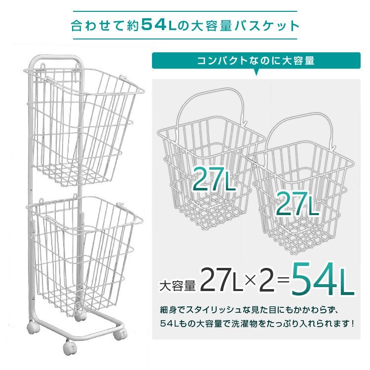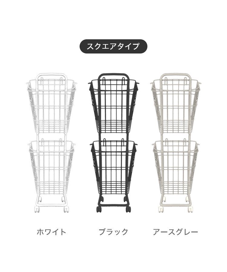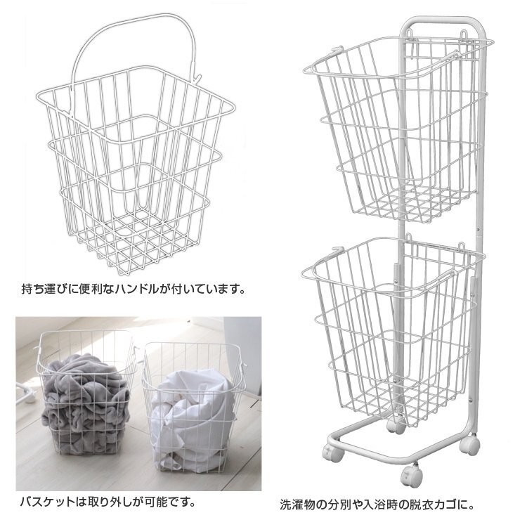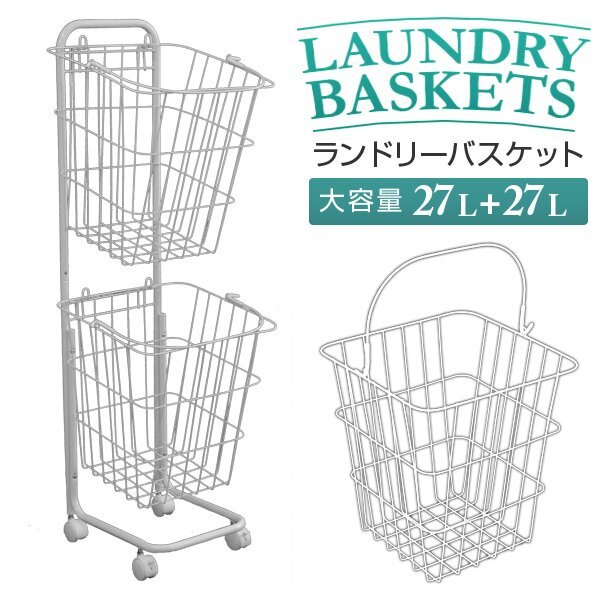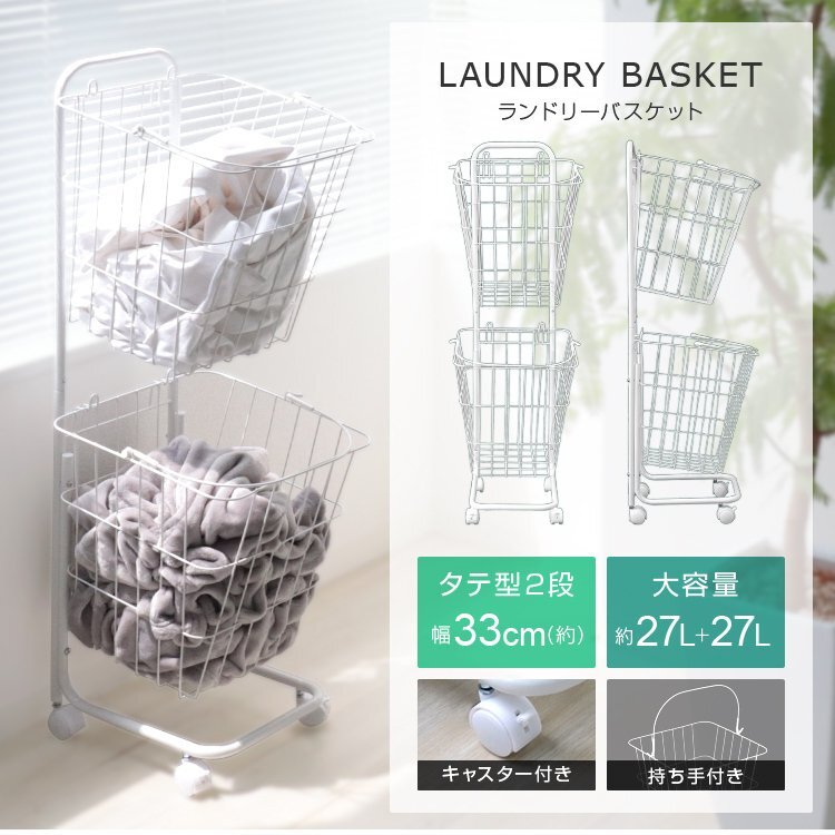真っ白なスチールのシンプルなデザイン! ランドリーバスケットが2台収納できるランドリーワゴンです。 バスケットは上下共に27Lとなっております。 キャスターが付いているので、移動もラクラク♪ コーナーが開いたデザインになっているので、縦置き・横置きでもランドリーバスケットが取り出しやすくなっています。 ランドリー以外にキッチンの食品ストッカー、リビングの雑貨入れ、おもちゃ収納も使えます! 【商品仕様】 カラー:ホワイト(スクエア) サイズ:(約)幅37.5×奥行き37.5×高さ106.5cm バスケット内寸:(約)幅33×奥行き33×高さ35cm 重量:(約)2.74kg(カゴ単体:0.63kg) 容量:(約)27L × 2 バスケット耐荷重:(約)10kg 素材:スチール、ナイロン |