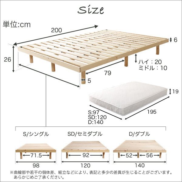 | <ベッド> 【カラー】 ブラウン、ナチュラル、ホワイトウォッシュ 【サイズ】 幅140x奥行200x高さ6/16/26cm 【重量】 25.2kg 【素材】 本体:天然木(パイン材) すのこ:合板(LVL) 表面材:ラッカー塗装(ホワイトウォッシュ、ブラウン) 無塗装(ナチュラル) 【梱包】2梱包でお届けします。 2-1 サイズ:142x25x13cm、重量:17.25kg 2-2 サイズ:100x21x13cm、重量:9.15kg 【組み立て品】 お客様による組み立てが必要です。 <マットレス> 【カラー】 ホワイト 【サイズ】 幅140x奥行195x高さ19cm(コイル数:682個) 【重量】 23.5kg 【素材】 張り材:ポリエステル100% クッション材:ポケットコイル、ウレタンフォーム、不織布 【梱包】 サイズ:38x38x76cm、重量:25kg 【ご注意】 サイズ、重量は概算です。 |