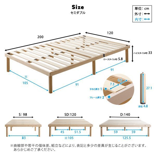 | 今回の出品でお求めいただける商品は パイン材高さ2段階調整脚付きすのこベッド シリーズ セミダブル です。宜しくお願いします。 |
