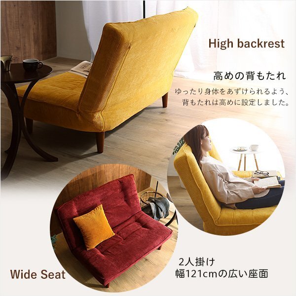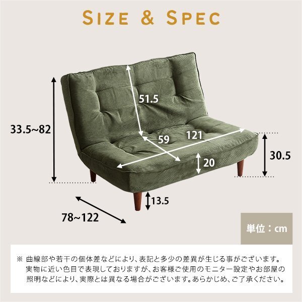 | 【カラー】 ベージュ、ブラウン、グリーン、ネイビー、レッド、イエロー 【サイズ】 W121×D78-122×H33.5-82cm 【重量】 17kg 【素材】 側生地:コーデュロイ=ポリエステル91%、ナイロン9% 構造部材:スチールパイプ、ポケットコイルスプリング 中身:ウレタンフォーム 【梱包】 サイズ:117×70×50cm、重量:18kg 【完成品】 脚のみ取付けです。 【ご注意】 ・サイズ、重量は概算です。 ・商品カラーはご使用のモニターによって実際の明るさや色と異なって見える場合がございます。 |