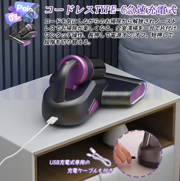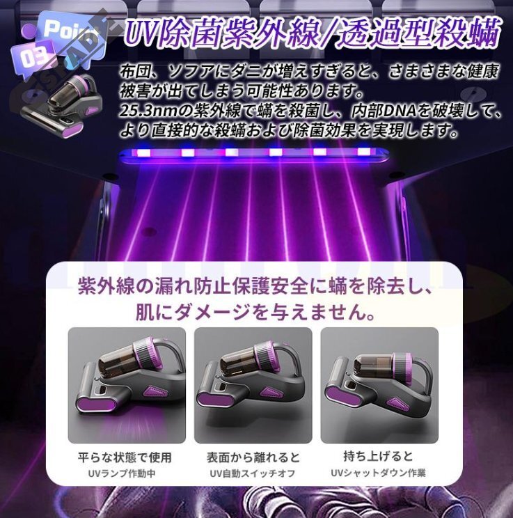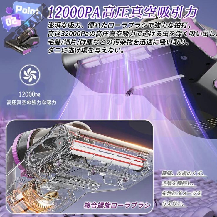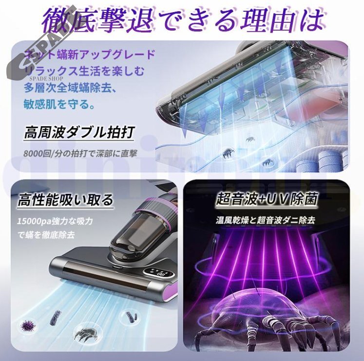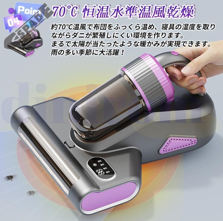| おすすめポイント | 最大18KPaの超強力吸引で、布団・マットレスの奥深くまでダニやハウスダストを徹底除去 UV-C紫外線ランプ搭載で、99.9%除菌・花粉やアレルゲン対策にも効果的 高周波振動+70℃温風でダニの死滅をサポート、梅雨や湿気対策にも最適 コードレス&軽量設計で、寝具・ソファ・車内も楽々掃除可能 取り外しやすい分離式構造+フィルター6個付属、水洗い対応で衛生的に長く使える |