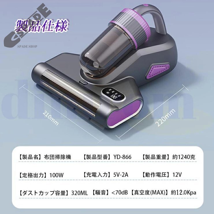 | 商品情報 | 商品名: 分離式掃除機・布団クリーナー 定格電圧: 12V 入力電圧: 5V / 2A 消費電力: 100W 商品サイズ: 約220mm × 210mm 付属品: 本体、フィルター×6、充電用USBケーブル、PDF日本語取扱説明書 |
