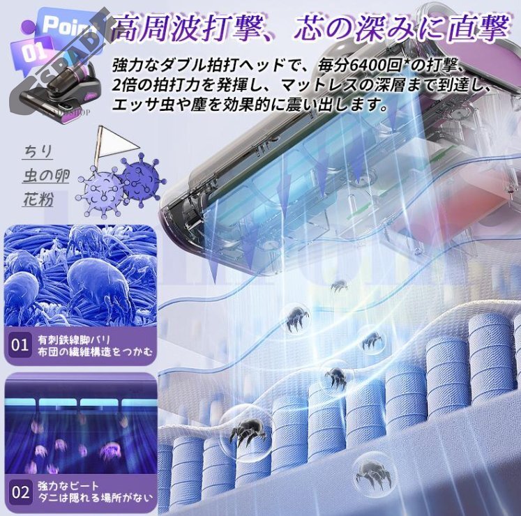 | 商品特徴 | 18KPa強力吸引+高周波振動 毎分高速振動による叩き出しと18KPaの吸引力で、マットレスや枕、カーペットに潜む微細なホコリ、ダニ、花粉を強力除去。 UV除菌+温風乾燥 内蔵されたUV-Cランプが99.9%の除菌効果を発揮。さらに70℃の温風で湿気やダニの繁殖を抑え、より清潔な睡眠環境を実現します。 コードレス&静音設計 コードが邪魔にならず、自由に持ち運び可能。稼働中の音も70dB未満に抑えられ、夜間や赤ちゃんがいる家庭でも安心して使えます。 分離式デザイン+水洗いOK ダストカップやフィルターはワンタッチで取り外し可能。6枚の交換用フィルター付きで、いつでも清潔に保てます。 |