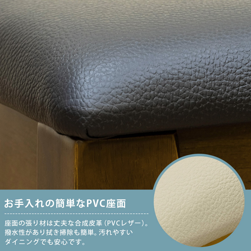 | 材質 | 天然木ラバーウッド(PU塗装) 座面張り材:合成皮革(PVC) 内材:ウレタンフォーム |
