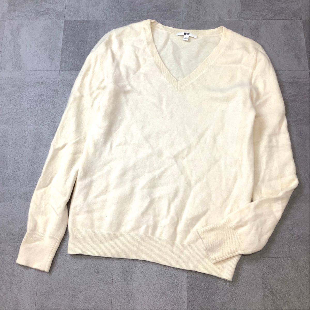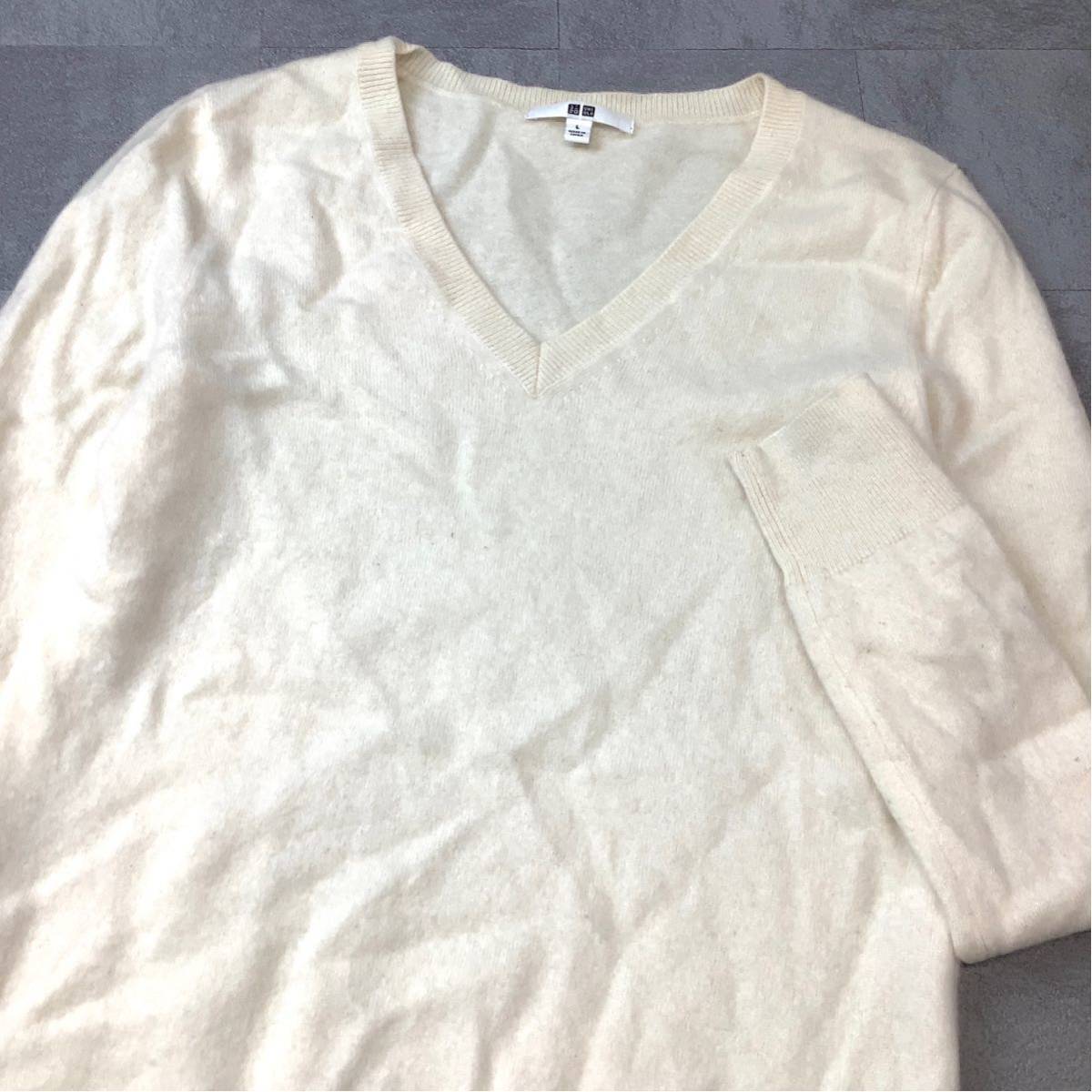 【高級感溢れるカシミヤ 100%】ユニクロ UNIQLO Vネック カシミアニット セーター レディース Lサイズ オフホワイト 滑らか着心地