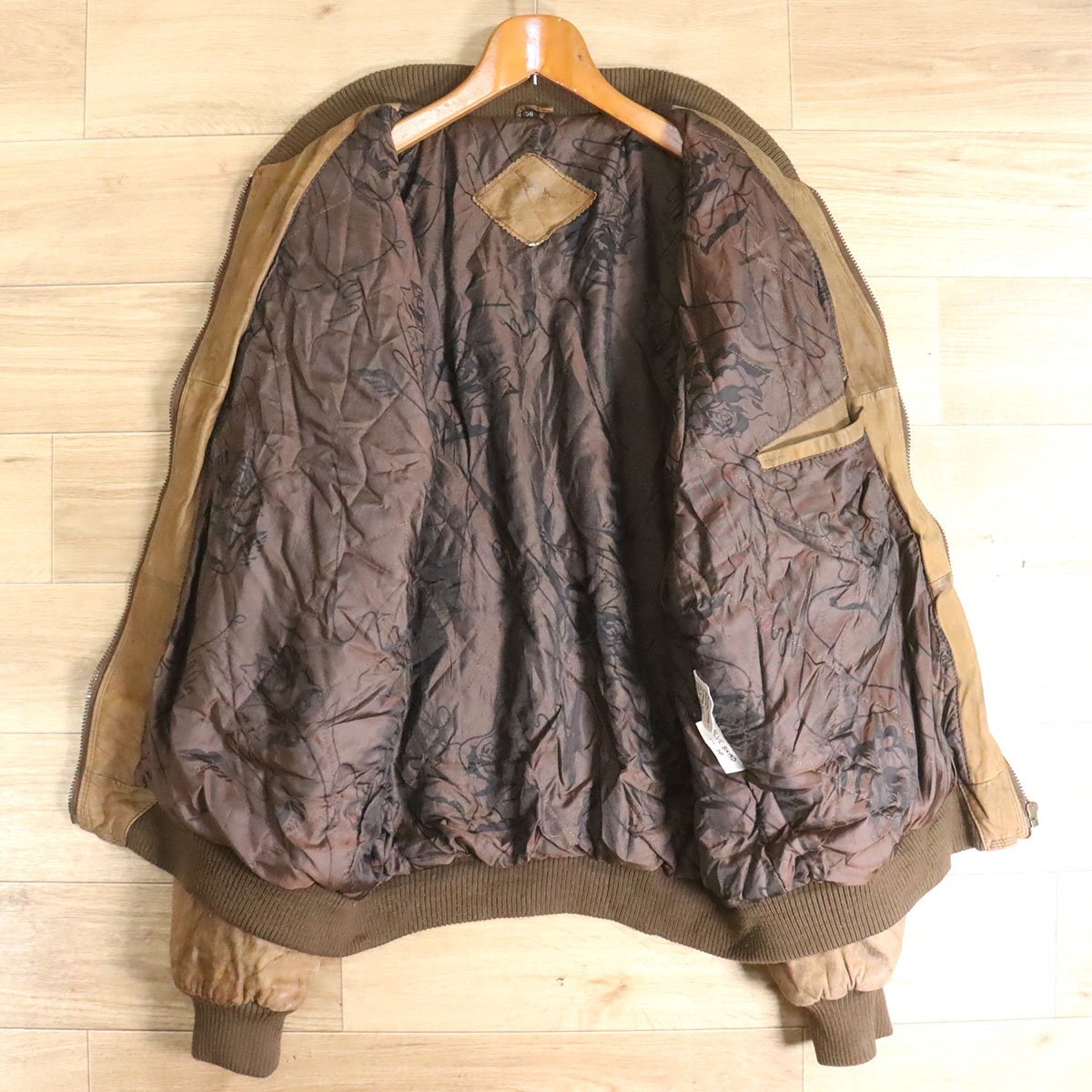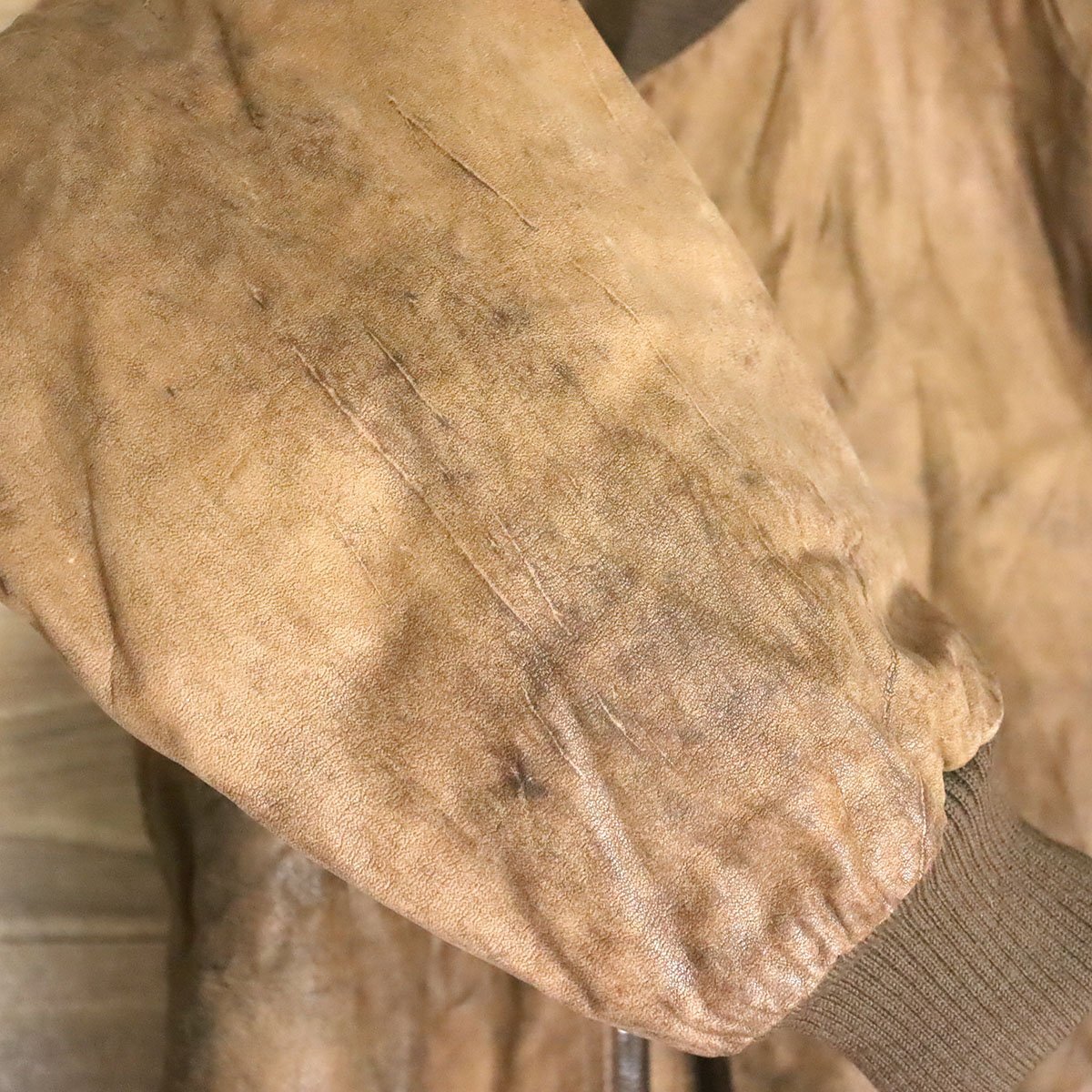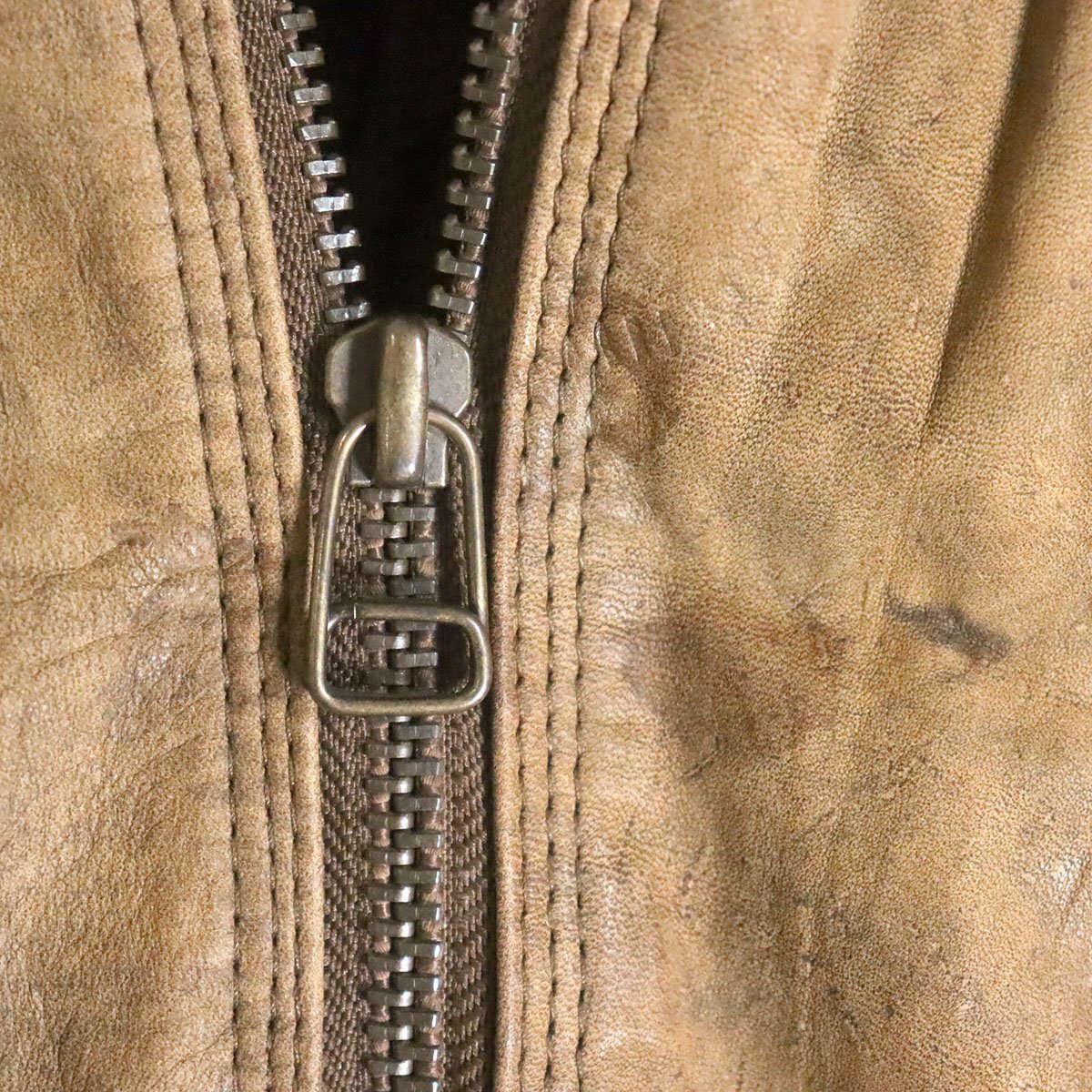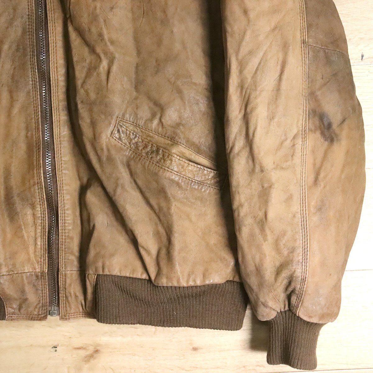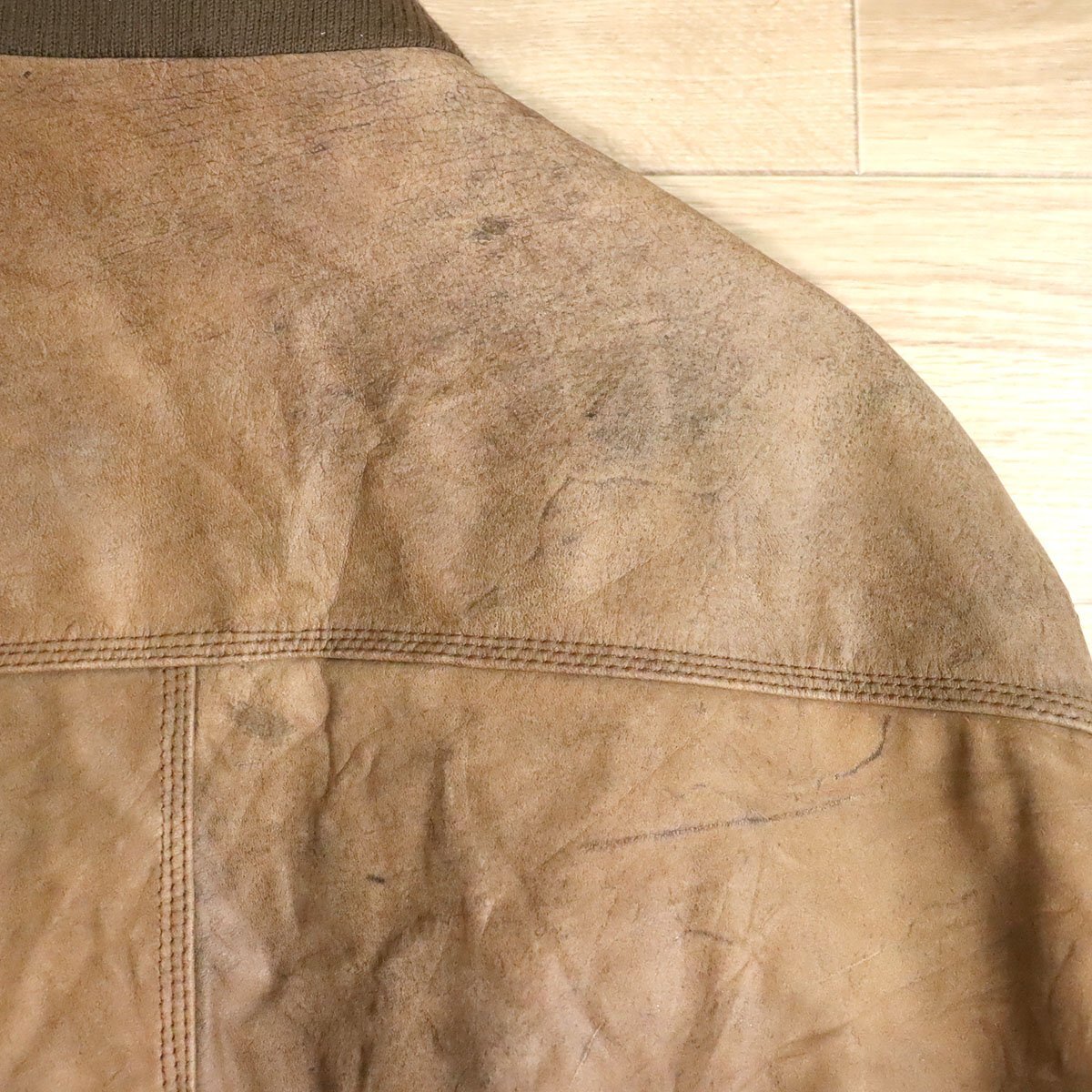 中古品です。使用感があります。全体の各所に経年によるレザー特有の擦れとアタリと汚れ、、フロントと袖と背面に汚れがありますが、他に大きなダメージはありません。