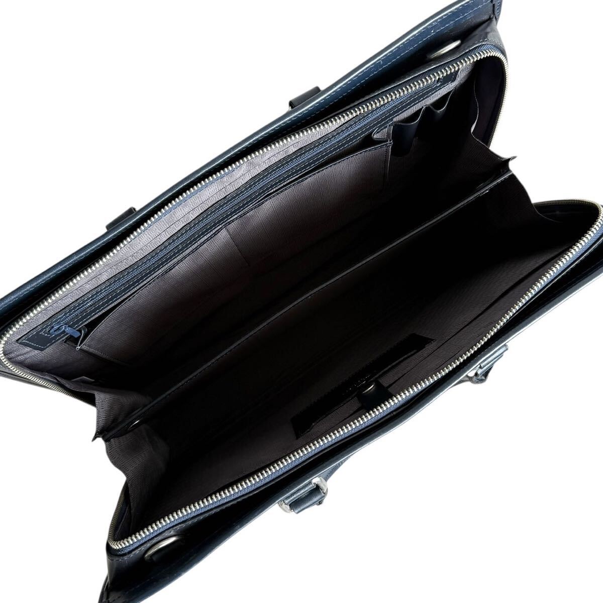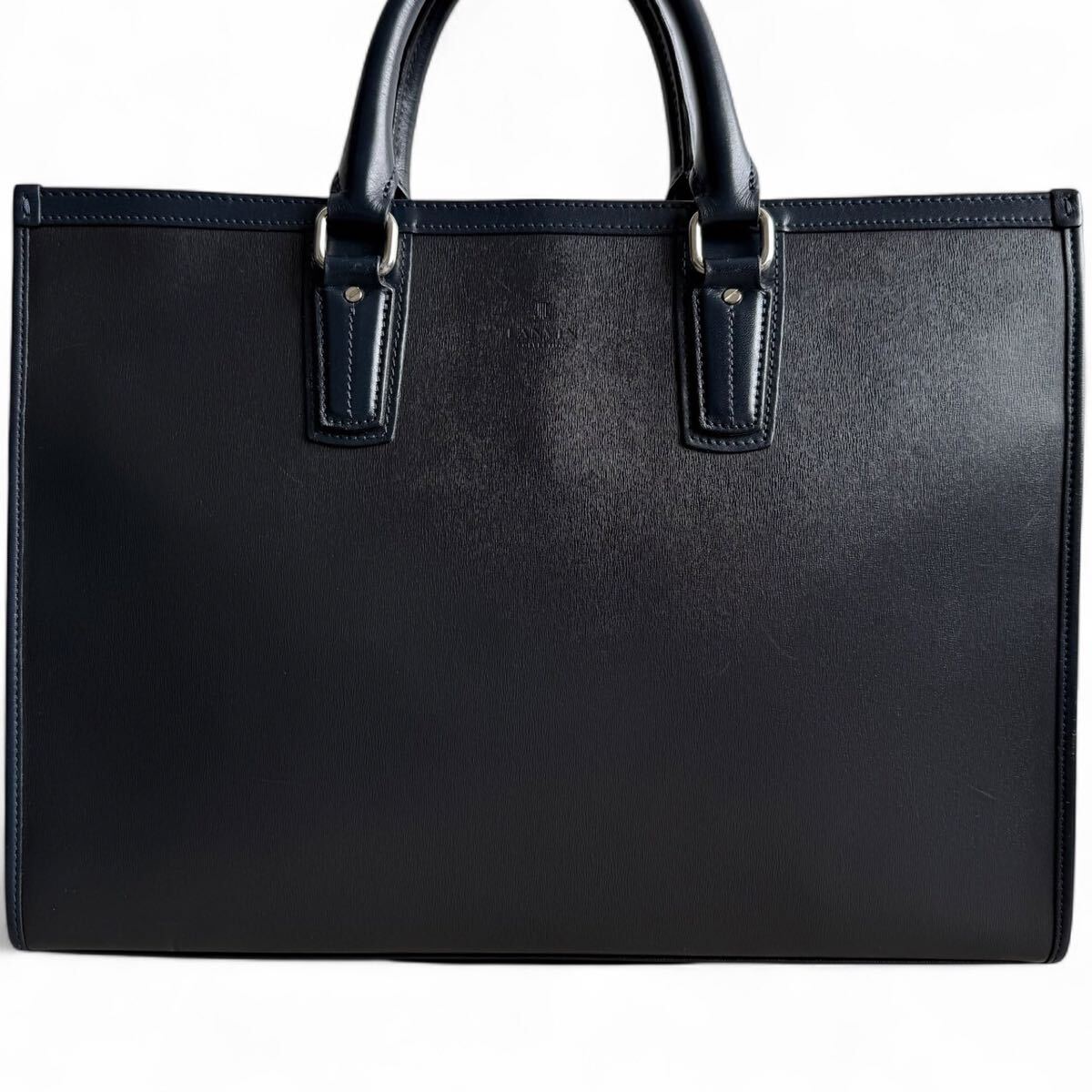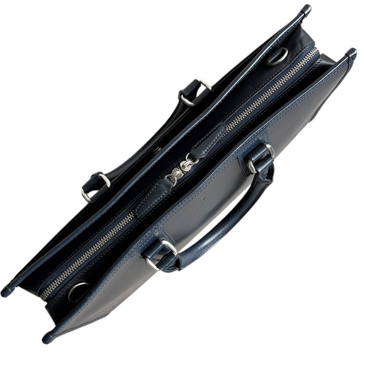 こちらは、深みのある上品なネイビーカラーが魅力のレザービジネスバッグ。端正なスクエアフォルムと、繊細な型押しロゴが控えめながら品格を漂わせ、ビジネスシーンで確かな存在感を放ちます。