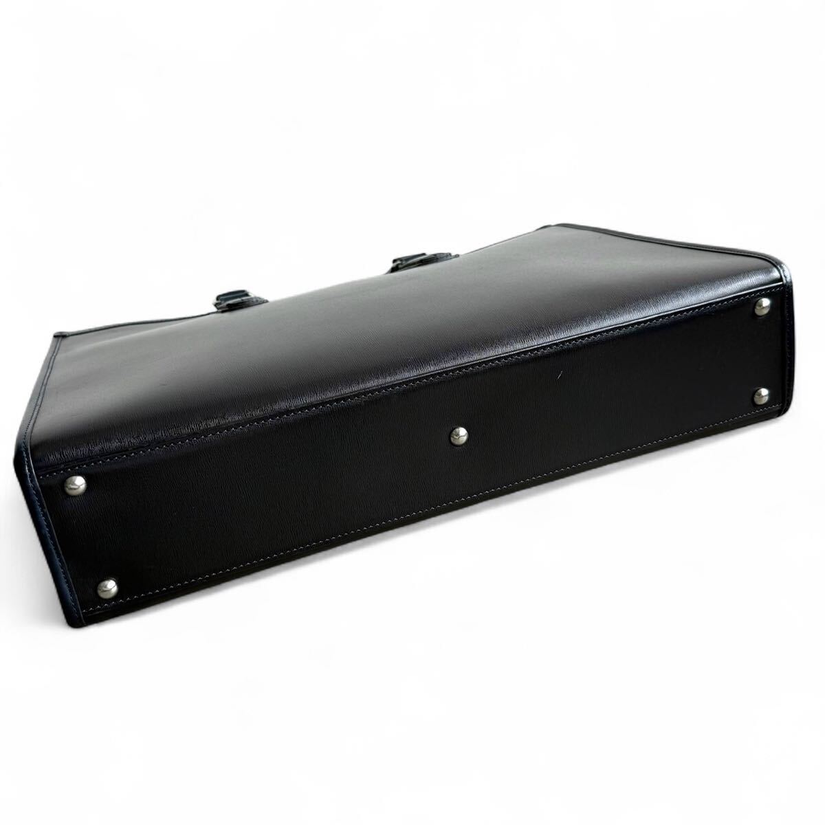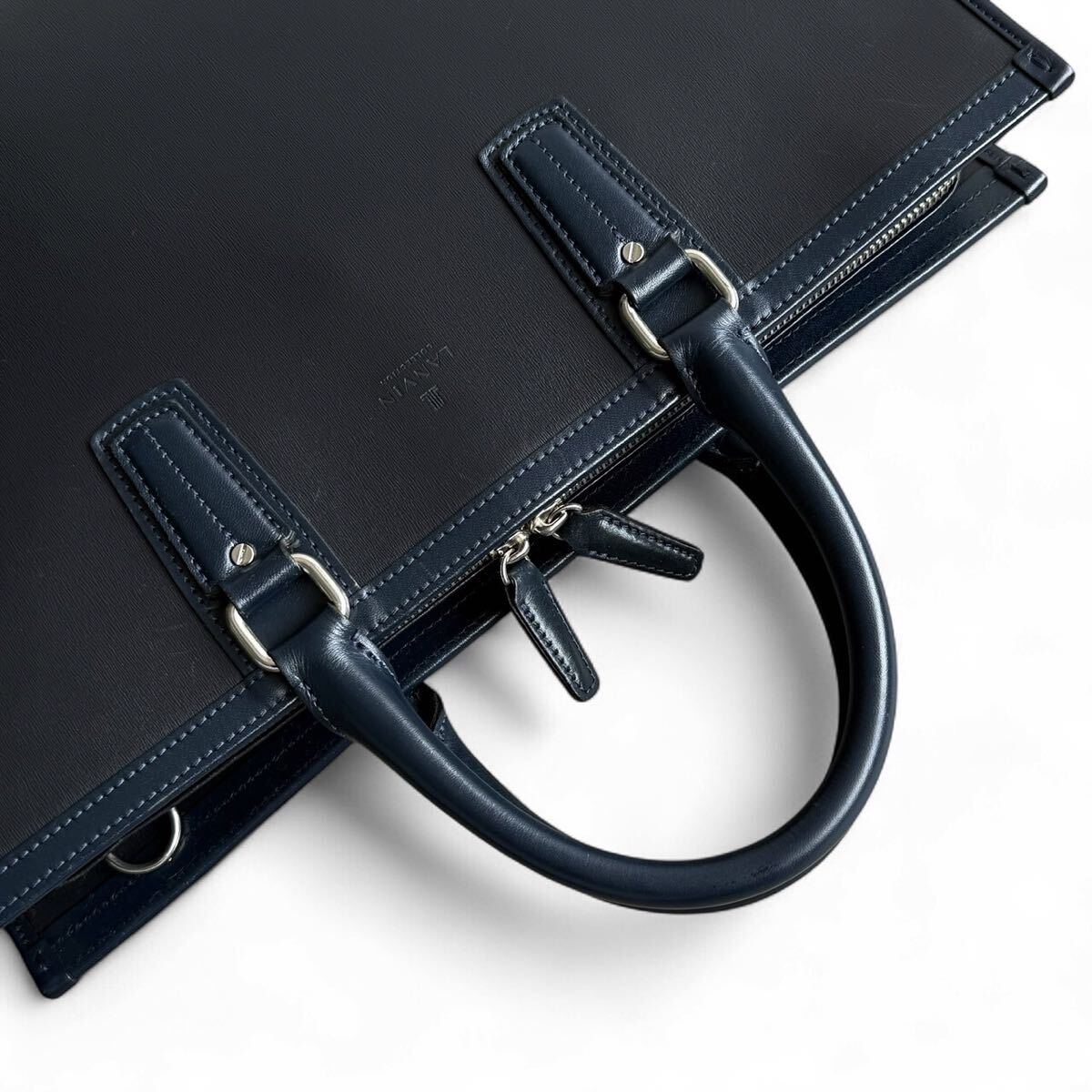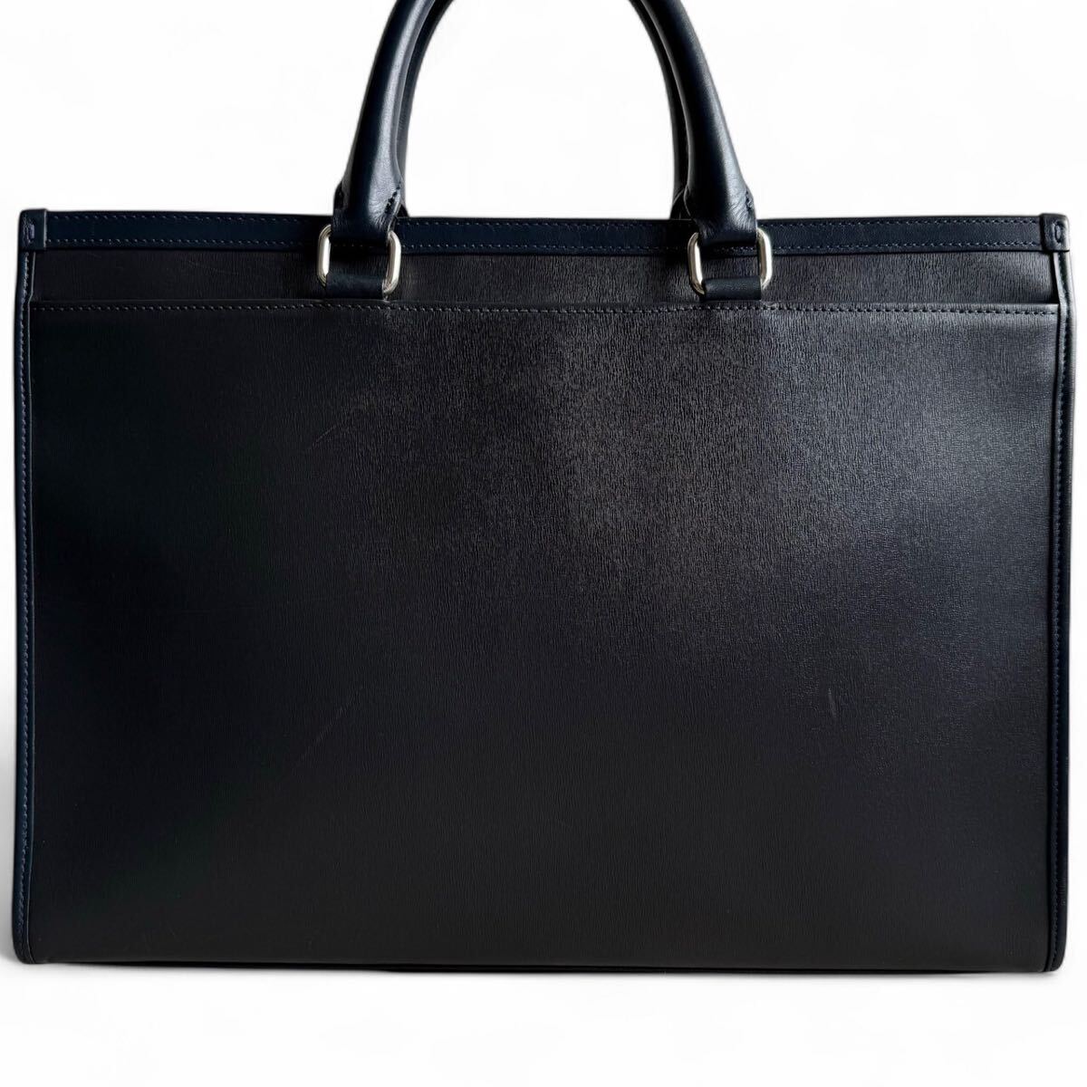 こちらは、深みのある上品なネイビーカラーが魅力のレザービジネスバッグ。端正なスクエアフォルムと、繊細な型押しロゴが控えめながら品格を漂わせ、ビジネスシーンで確かな存在感を放ちます。