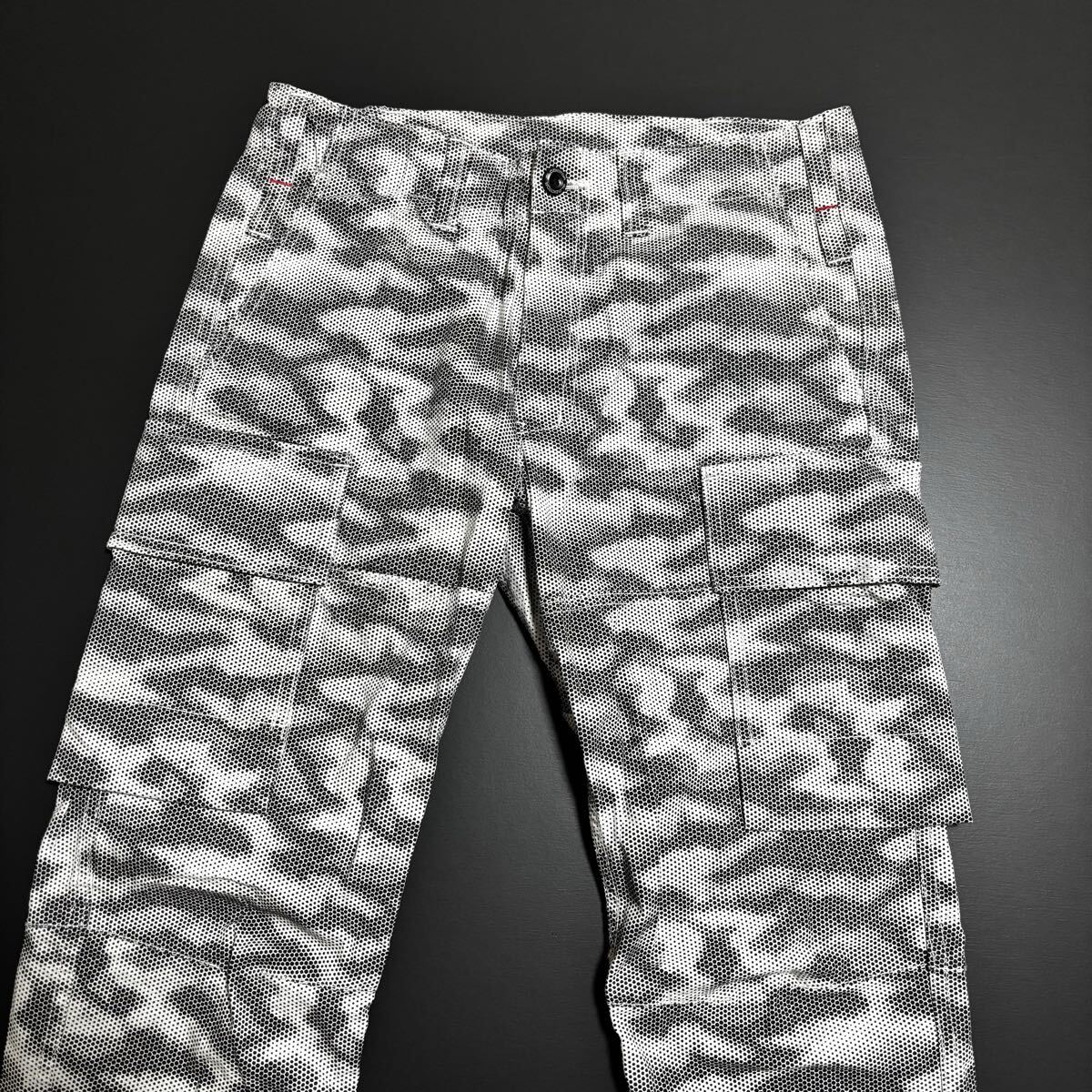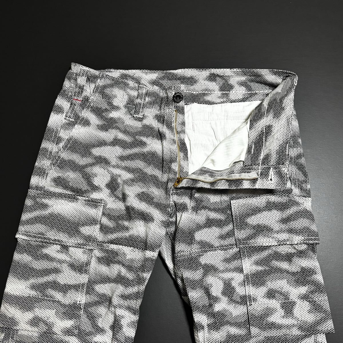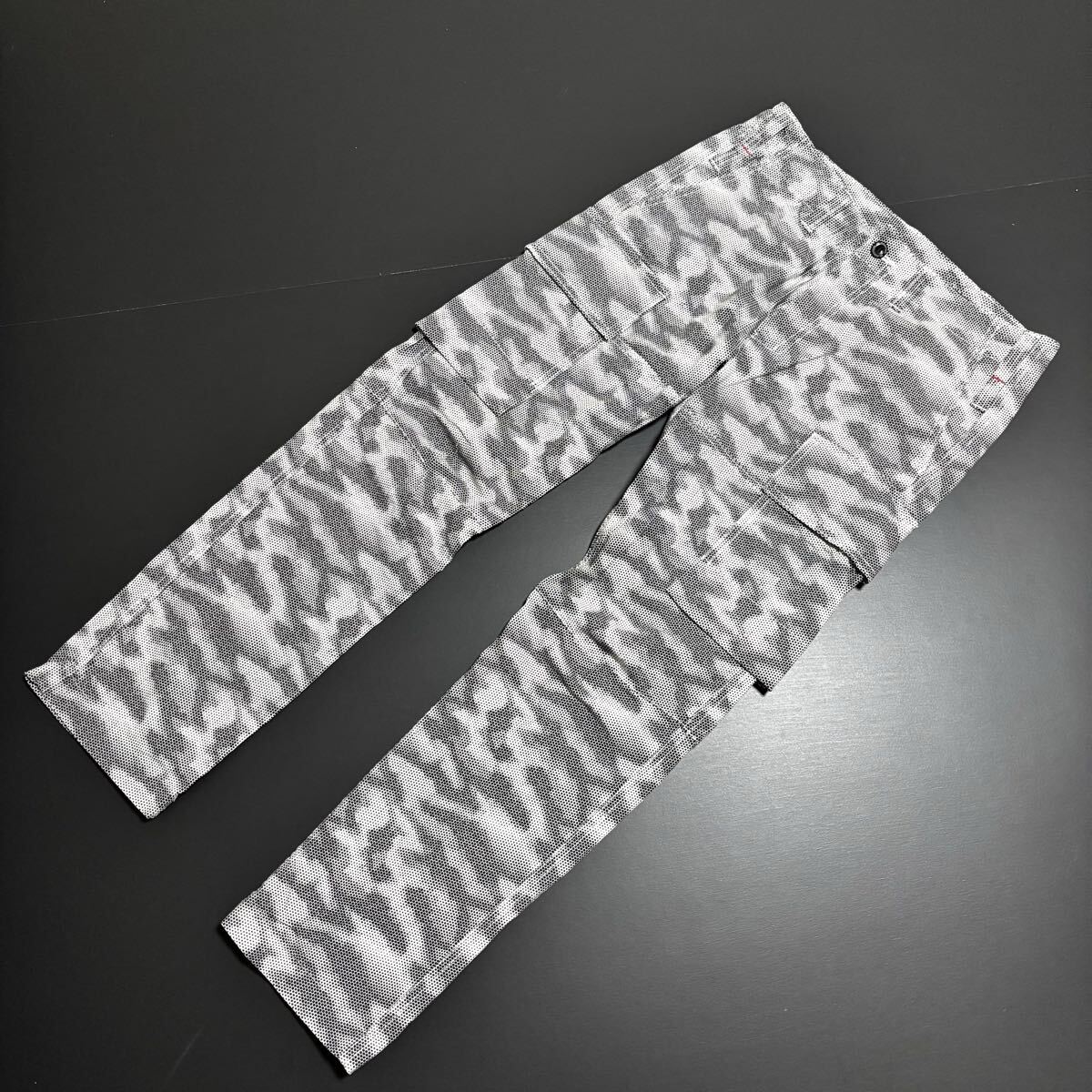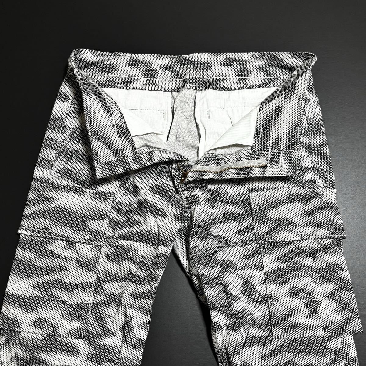 頑丈なリップストップ生地に、個性を生み出すドット柄プリントと心地よいストレッチ性をプラス。サイドのカーゴポケットは、底フラシ仕様にすることでモノあたりがしにくく、膝が曲げやすい。また、長財布もすっぽり収まる抜群の収納性もプラス。穿くたびに“進化”を体感する“進化系”ミリタリーカーゴパンツ。