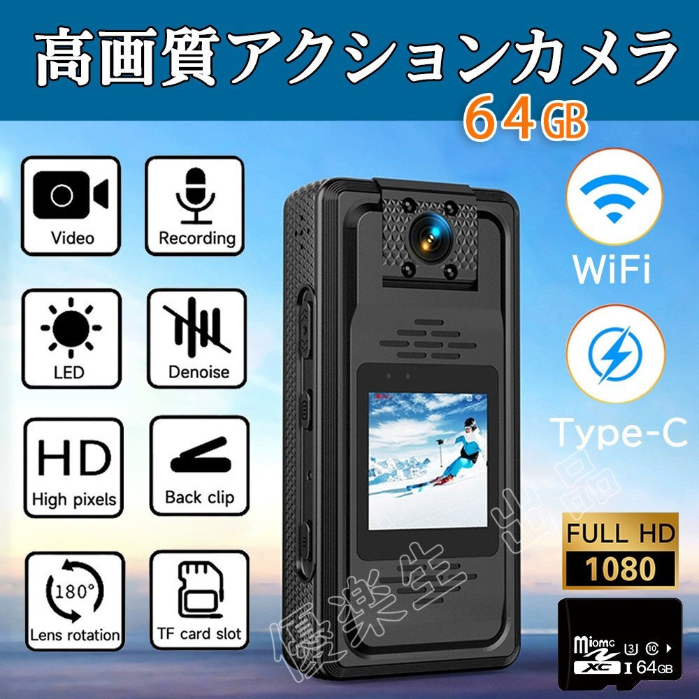 アクションカメラ 小型カメラ 2K 高画質 動画撮影 Vlog 小型 デジカメ バイク 64GB TFカード付き 録画 広角 wifi 180°回転 yhw056