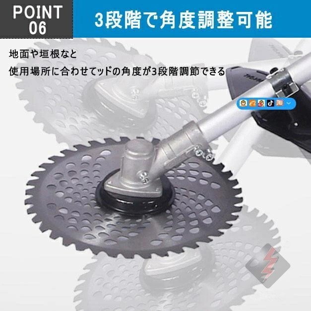 樹脂刃、金属刃、チップソーの3種類の替え刃を用意していますので、用途に合わせて適合な刃を交換できて、様々なシーンで大活躍!ループハンドルは、上下を調節することができるため、縦方向に動かしやすく、傾斜のある場所でも草刈りをおこなうことが可能です。