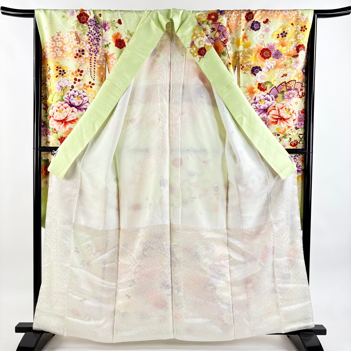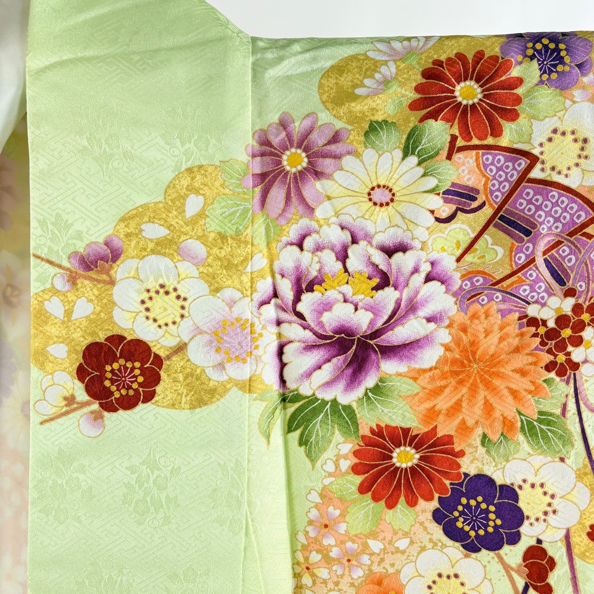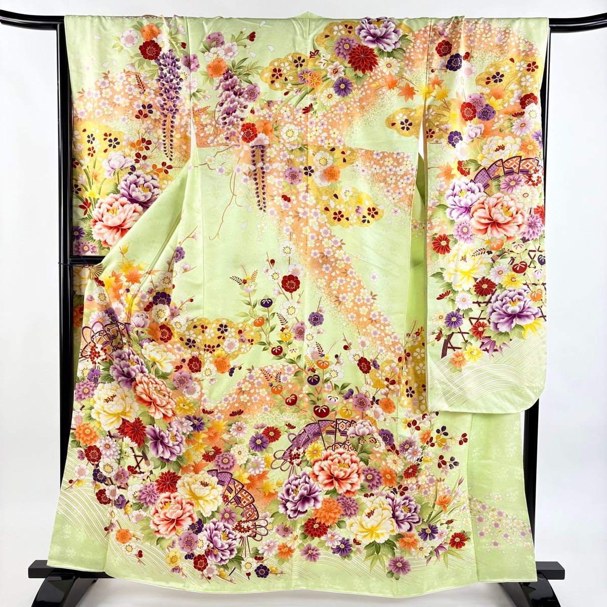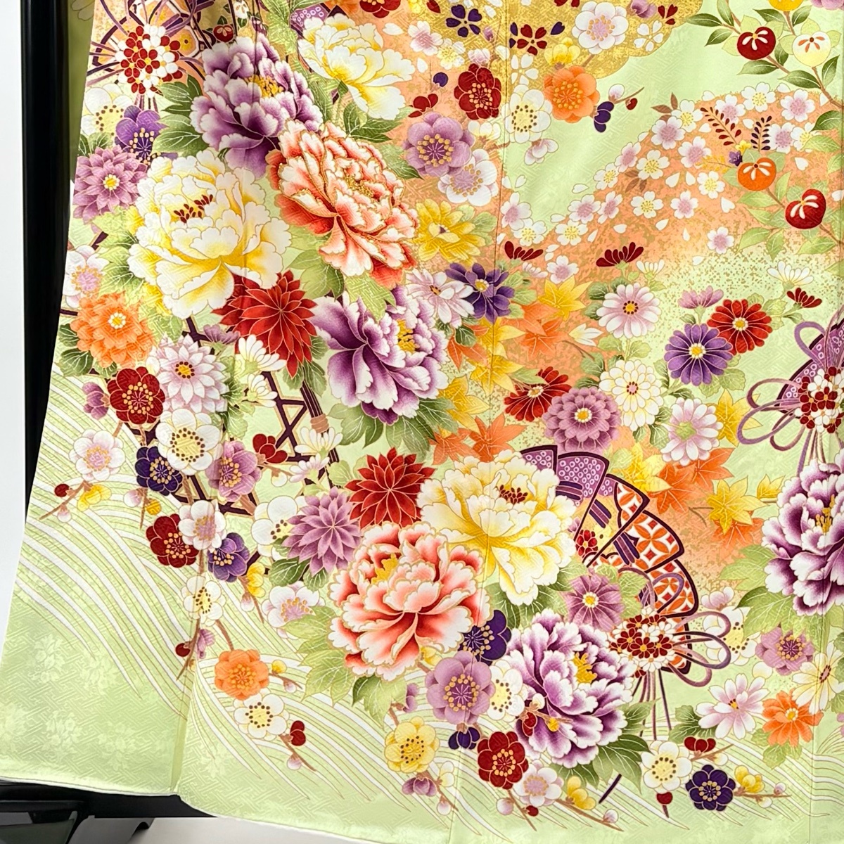| 振袖 美品 名品 袋帯フルセット 牡丹 桧扇 箔 金彩 薄緑 袷 身丈160 裄丈68 L 正絹 【中古】 |