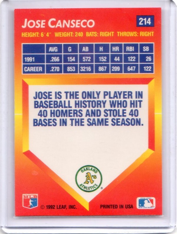 1992DONRUSS TRIPLE PLAY #214 ---------------------------------------------------- ■ホセ・カンセコ MLB成績 17年 1985-2001年 アスレチックス レンジャーズ レッドソックス ブルージェイズ デビルレイズ ヤンキース ホワイトソックス 1887試合 1877安打 462本塁打 1407打点 200盗塁 打率.266 1986年新人王 オールスター6回 本塁打王2回 打点王1回 1988年MVP 史上初40本塁打+40盗塁 カンセコ・ファンの方、是非どうぞ! |