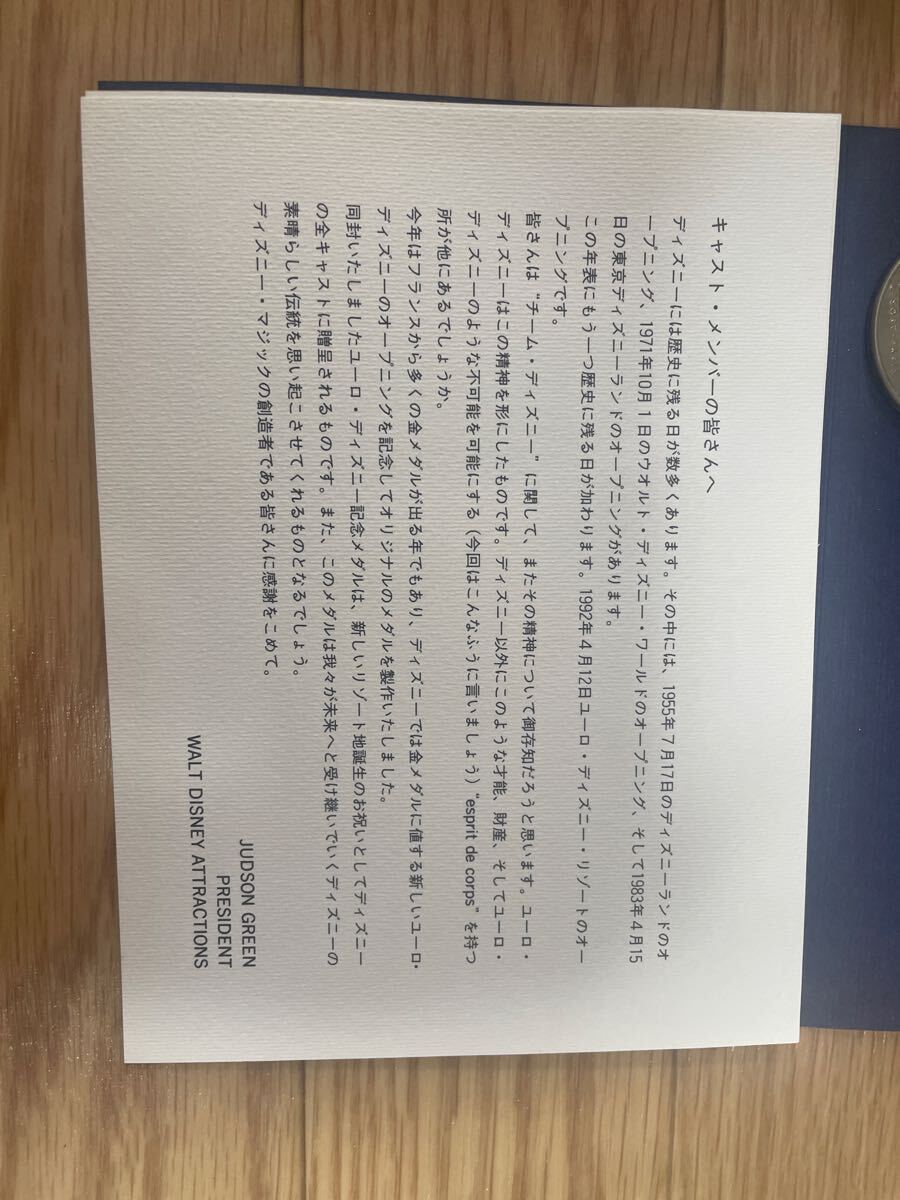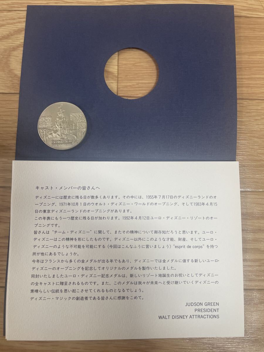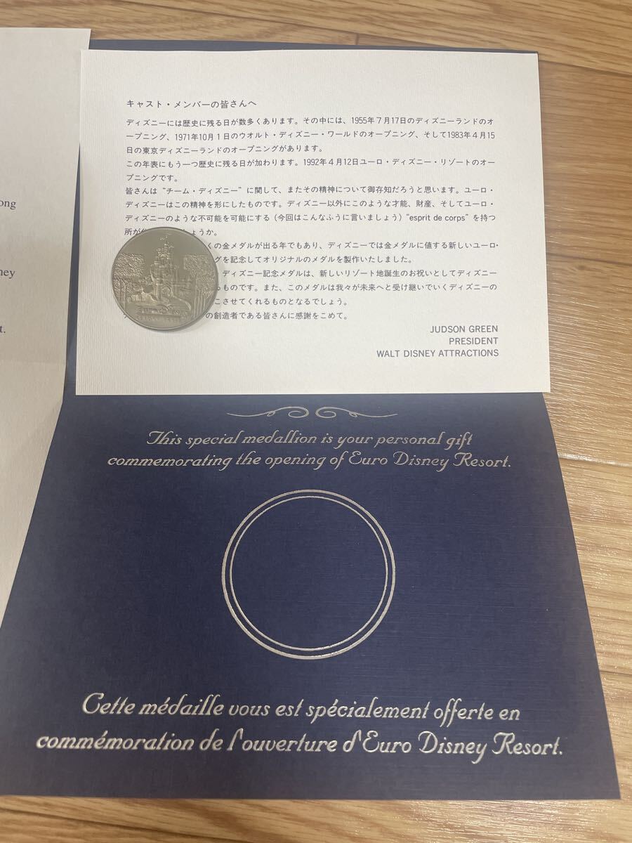 Disney ユーロ ディズニー リゾート オープニング 記念 キャスト 限定 配布 メダル メッセージ 外袋付